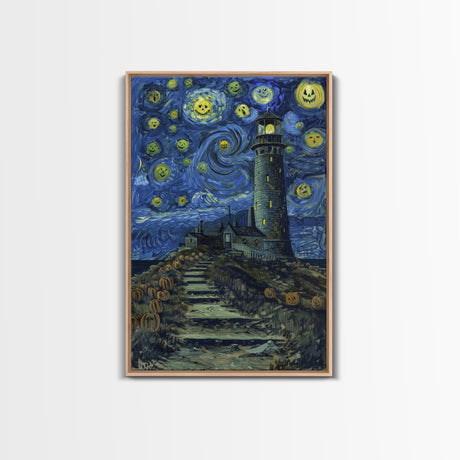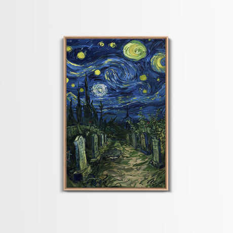 Starry Night Inspired Halloween Decor, Framed Canvas Print, Haunted Grave Yard
