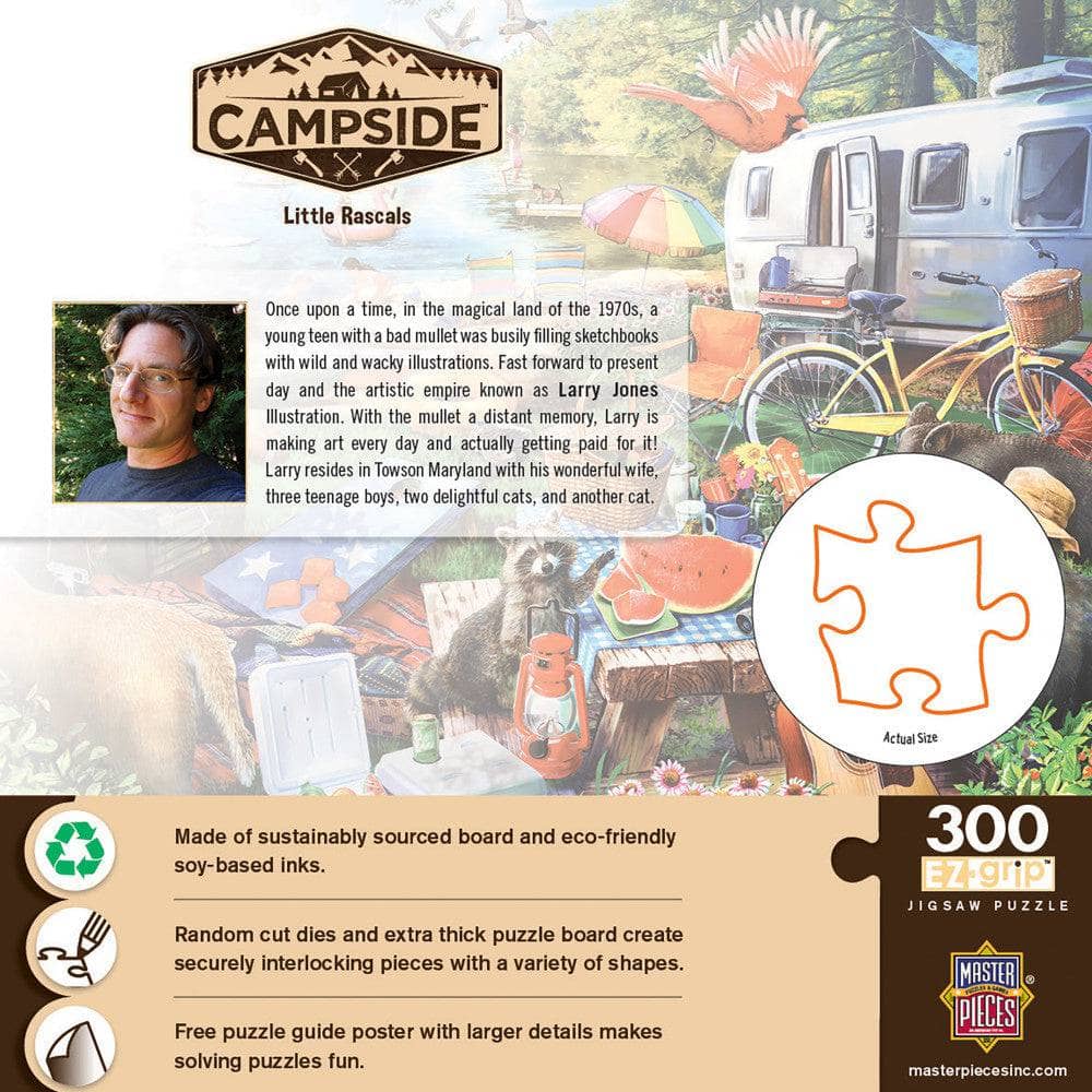 This MasterPieces 18" x 24" 300EZ Campside puzzle was painted by Larry Jones. Enjoy the mischief of a evening at the campground when furry friends come and join the party. To reduce its impact on our environment, the chipboard used in this puzzle is made of 100% recycled material.