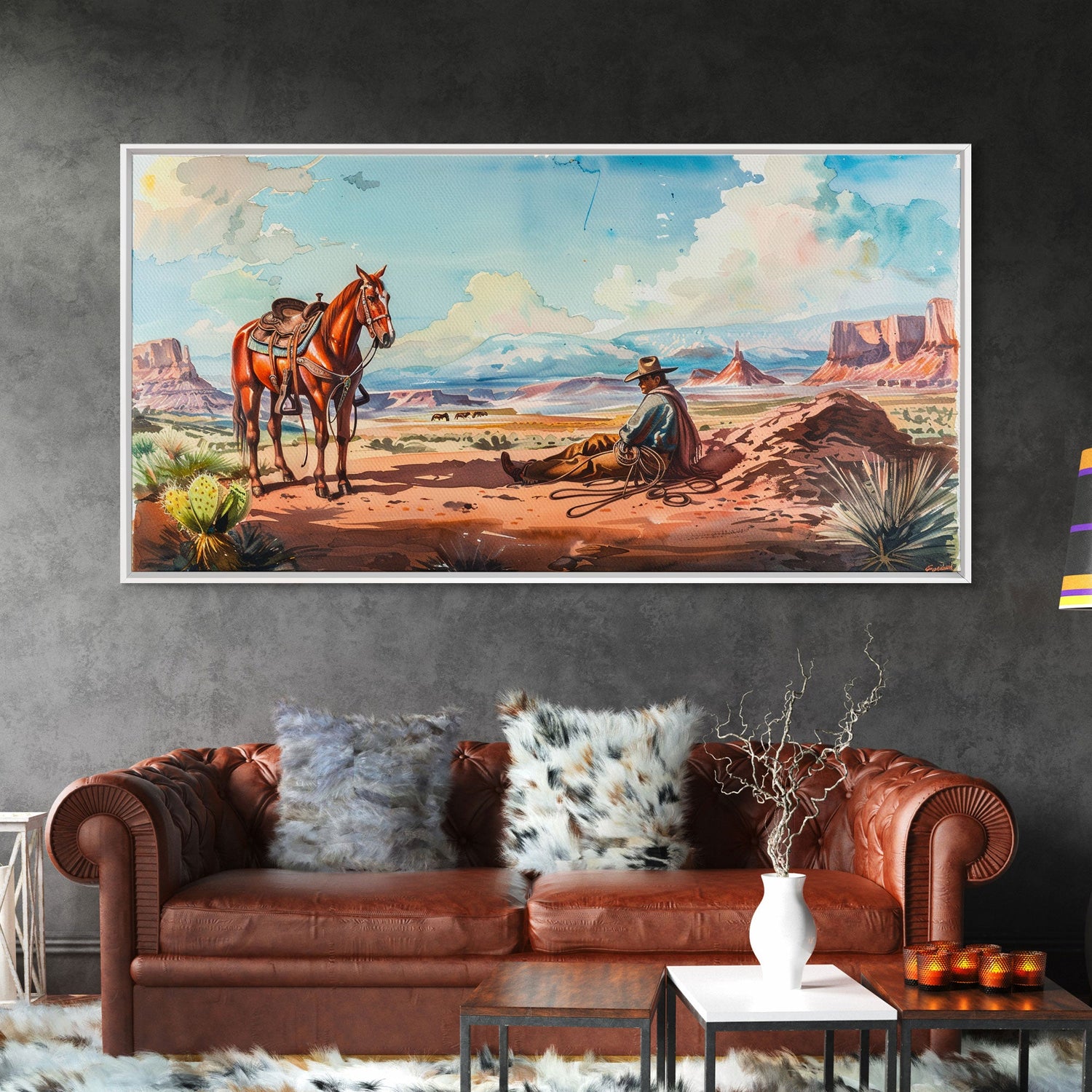 Cowboy Resting with Horse in Desert Landscape, Classic Western Art, Framed Canvas Print, Rustic Wall Decor, Living Room Decoration - 10x20 Inches / Gallery Wrap Canvas - Ready To Hang is backordered and will ship as soon as it is back in stock.