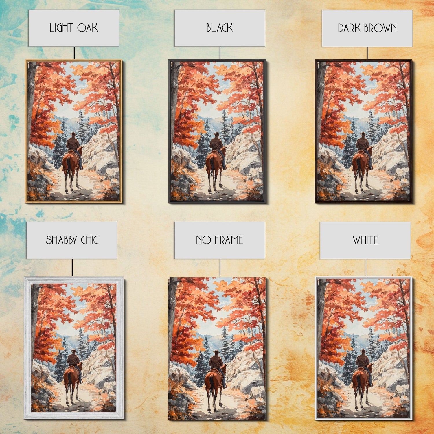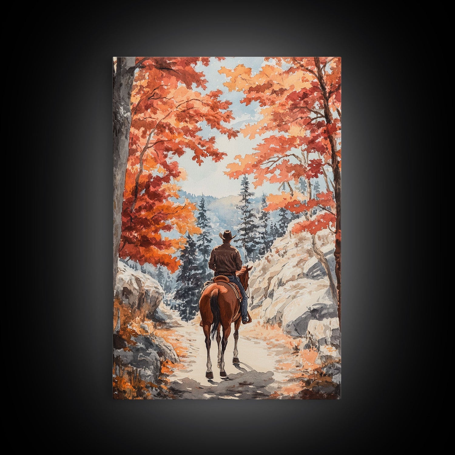 Cowboy riding through autumn forest, Framed Canvas Print, fall landscape wall art, western style decor for cozy homes, perfect gift idea