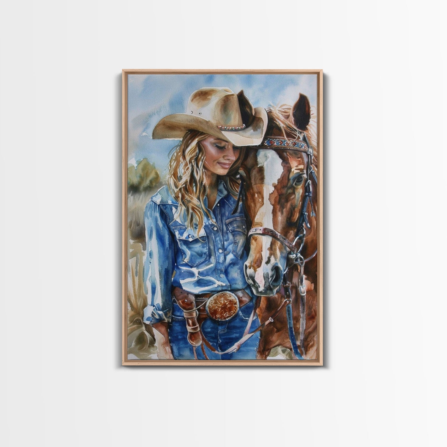Cowgirl Preparing Horse for Ride - Framed Canvas Print, Western Wall Art, Rustic Decor, Living Room and Bedroom Art Print