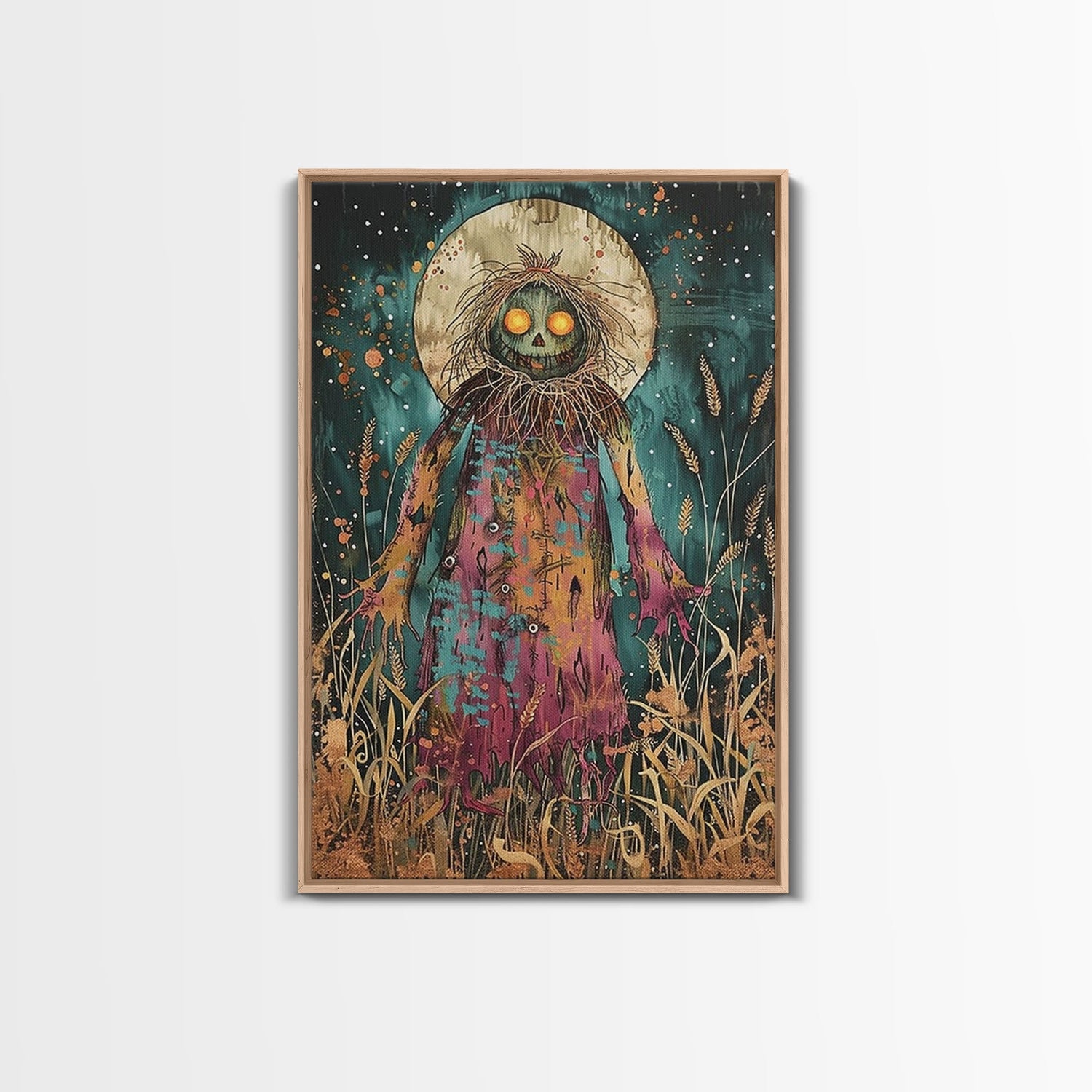Creepy Moonlit Scarecrow Framed Canvas Print | Halloween Art | Spooky Harvest Artwork | Sinister Scarecrow Art for Home Decor - 8x12 Inches / Gallery Wrap Canvas - Ready To Hang is backordered and will ship as soon as it is back in stock.