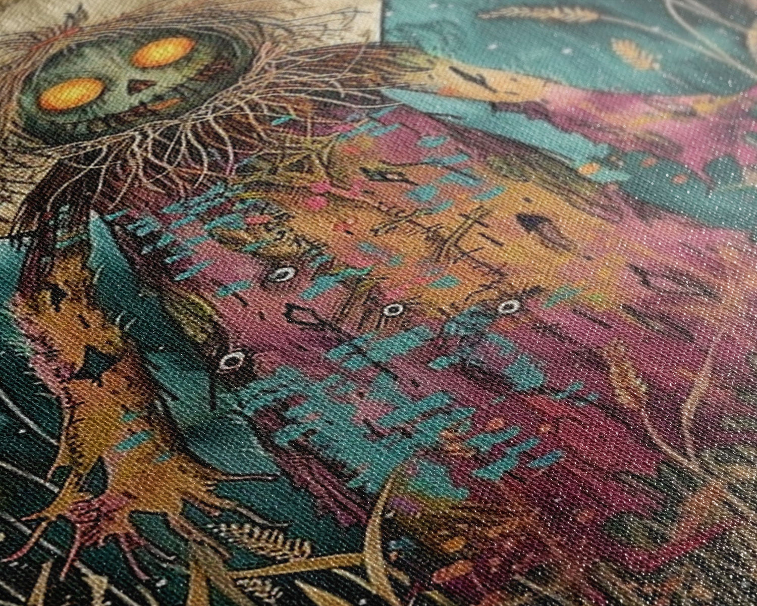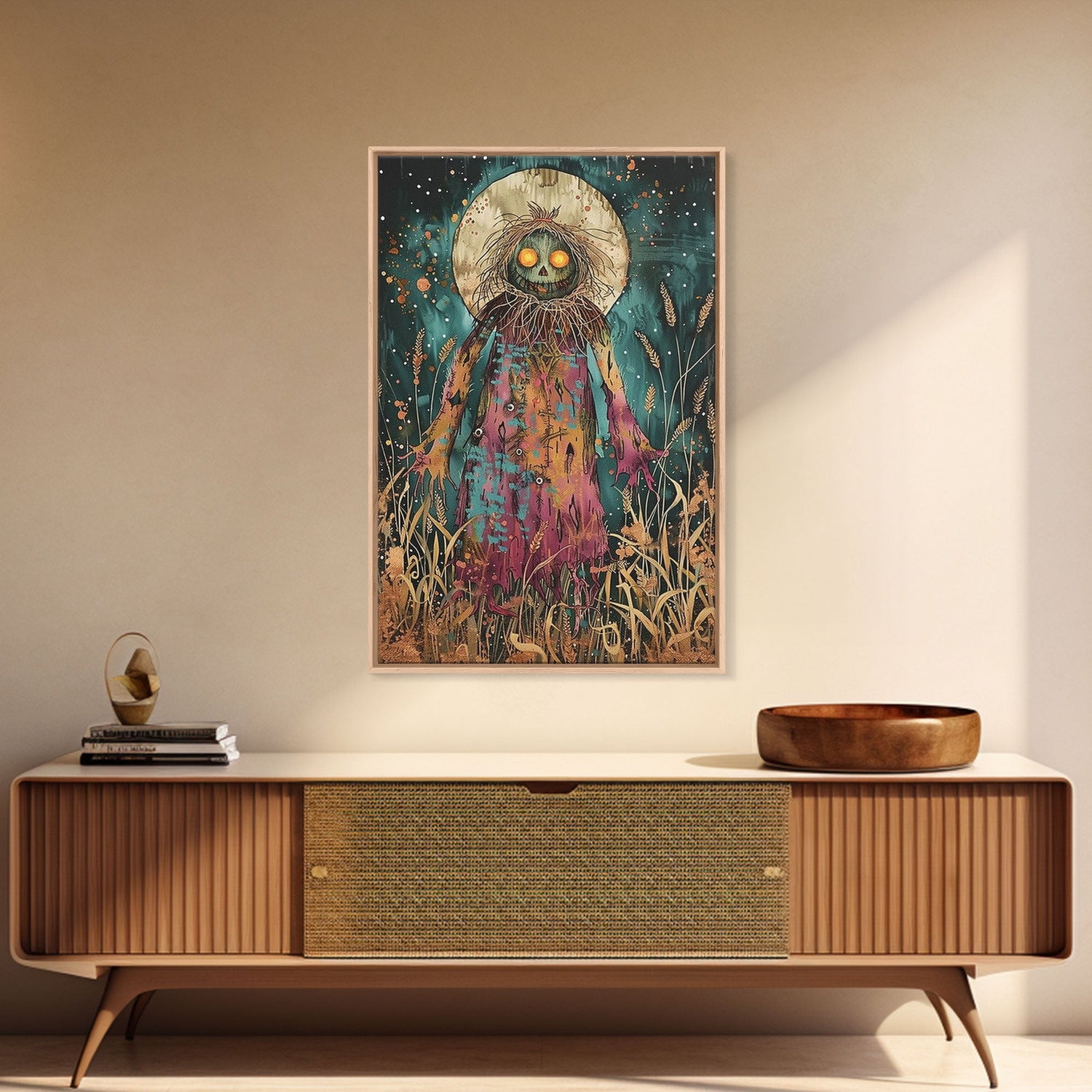 Creepy Moonlit Scarecrow Framed Canvas Print | Halloween Art | Spooky Harvest Artwork | Sinister Scarecrow Art for Home Decor