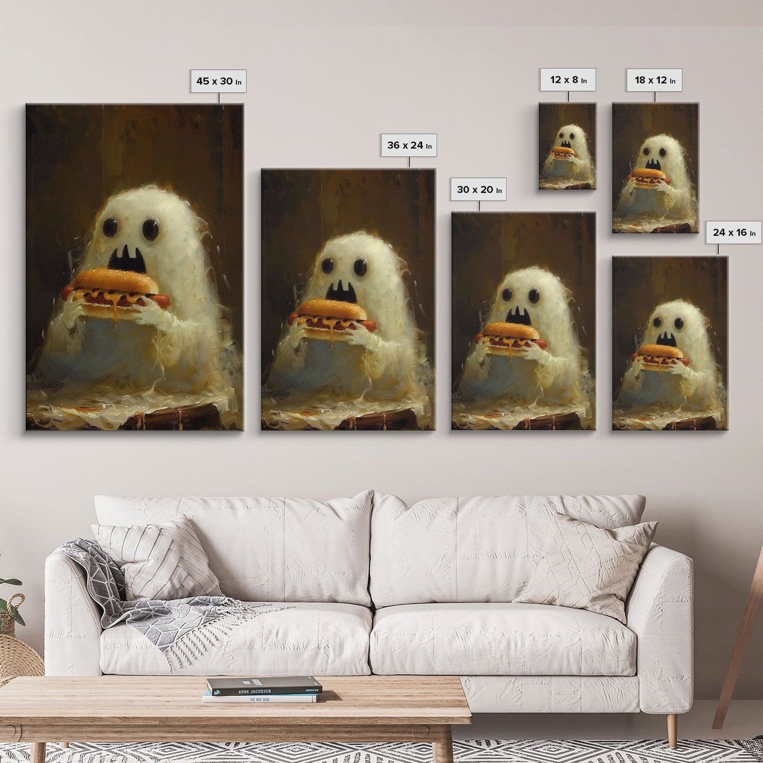 Cute Ghost Chompin on A Hot Dog, Ghostly Hot Dog Thief, Framed Canvas Print, Funny Halloween Spooky Season Art - 8x12 Inches / Gallery Wrap Canvas - Ready To Hang is backordered and will ship as soon as it is back in stock.