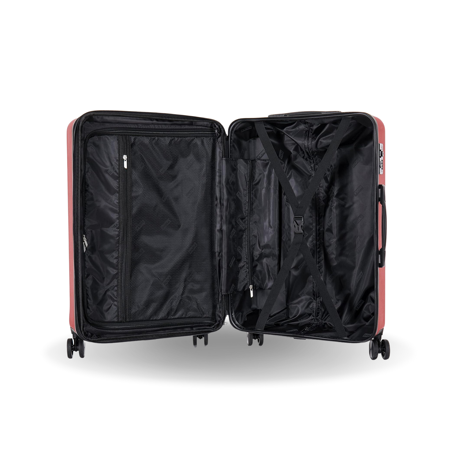 The Elysian Hardside Spinner Medium Luggage from InUSA is equipped with four spinner wheels, an adjustable trolley system, and comfortable handles. The interior is fully lined and includes various zippered pockets and elastic cross straps to keep your belongings organized.