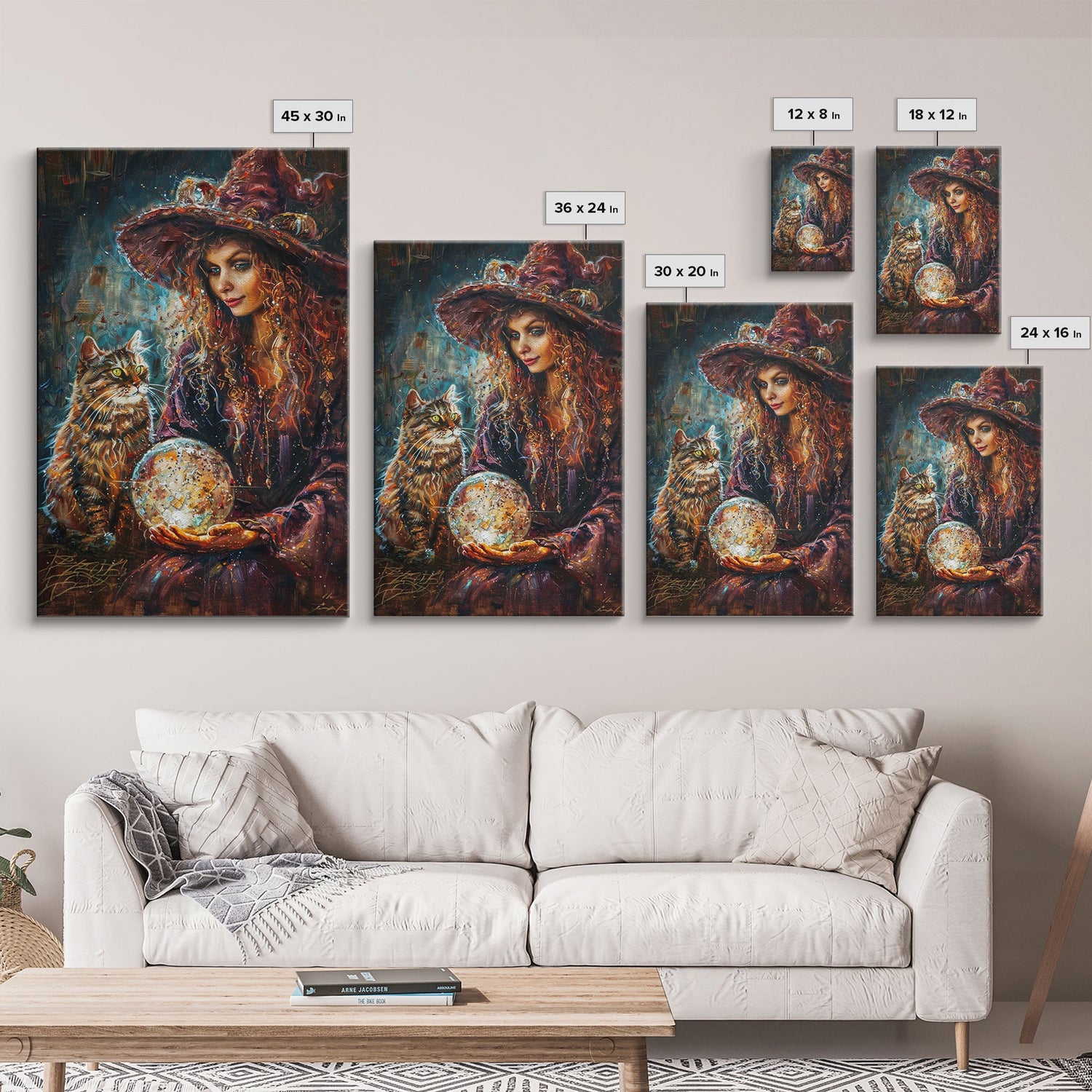 Enchanting Witch with Crystal Ball, Framed Canvas Print, Mystical Halloween Art, Spooky Witch Decor, Witchcraft Illustration, Magical Decor