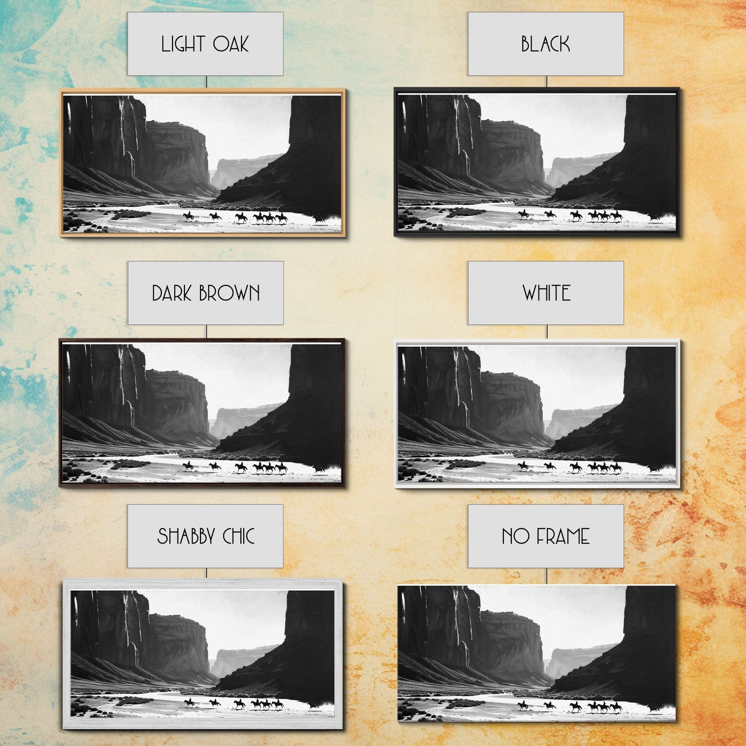 Framed Canvas Print of Cowboys Riding through Canyon, Western Wall Art for Living Room or Bedroom, Unique Home Decor - 10x20 Inches / Gallery Wrap Canvas - Ready To Hang is backordered and will ship as soon as it is back in stock.