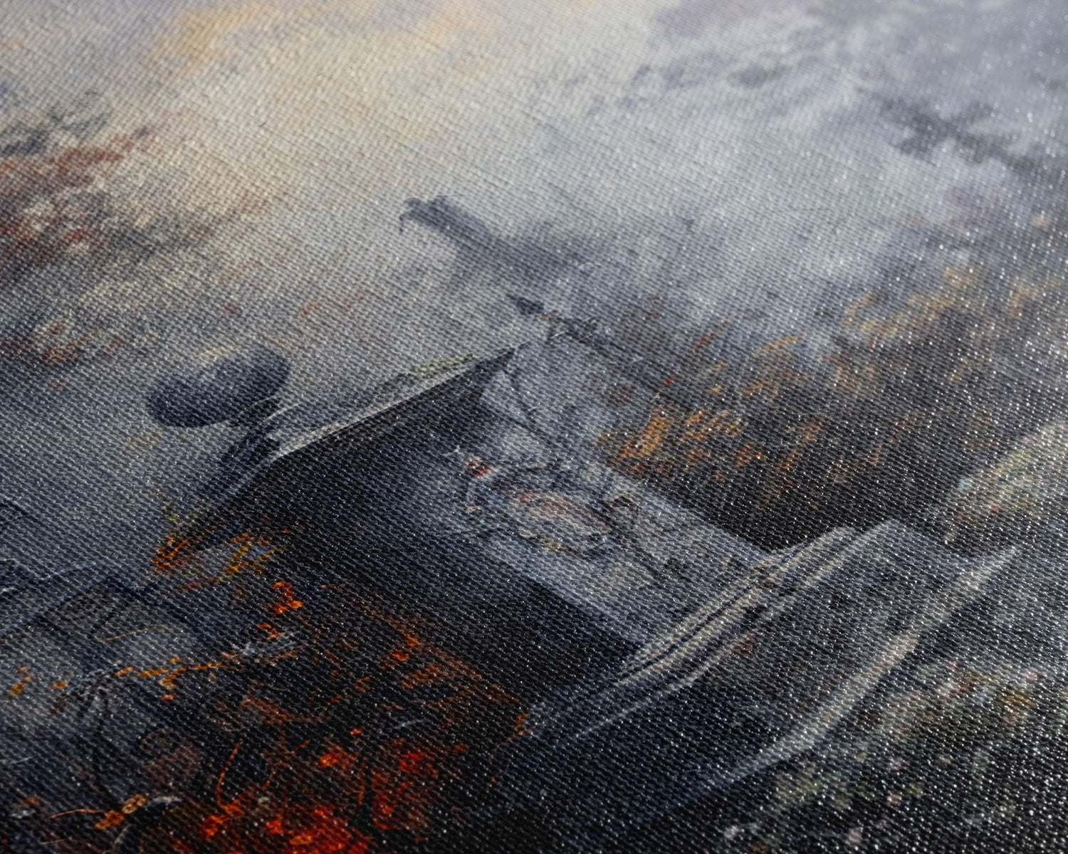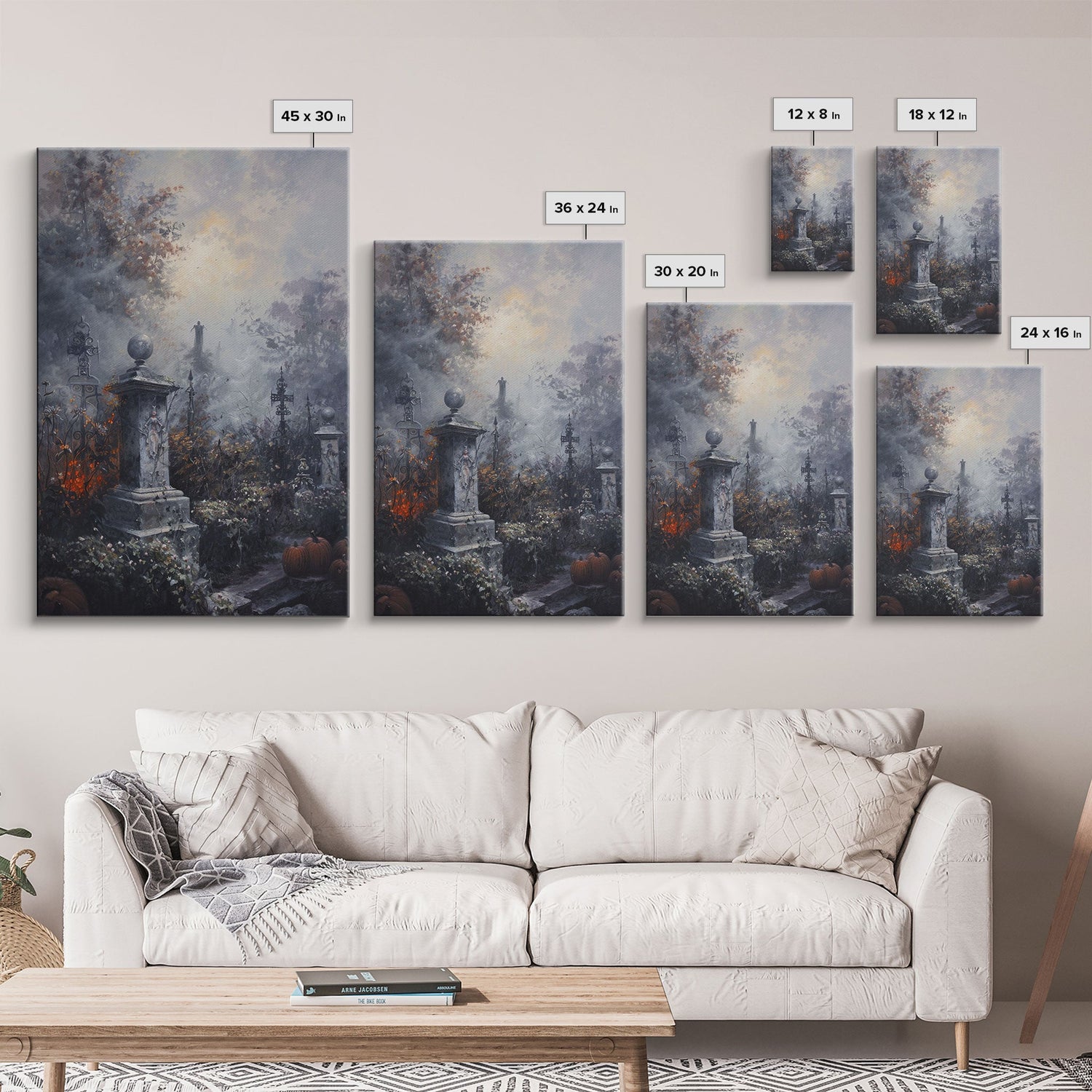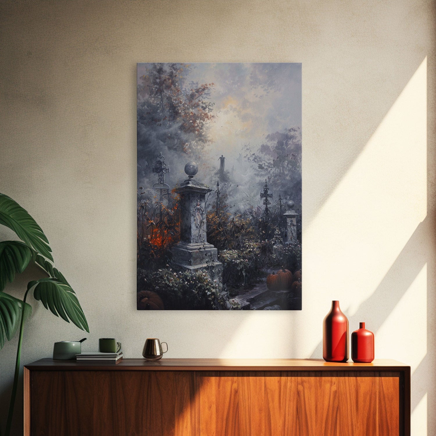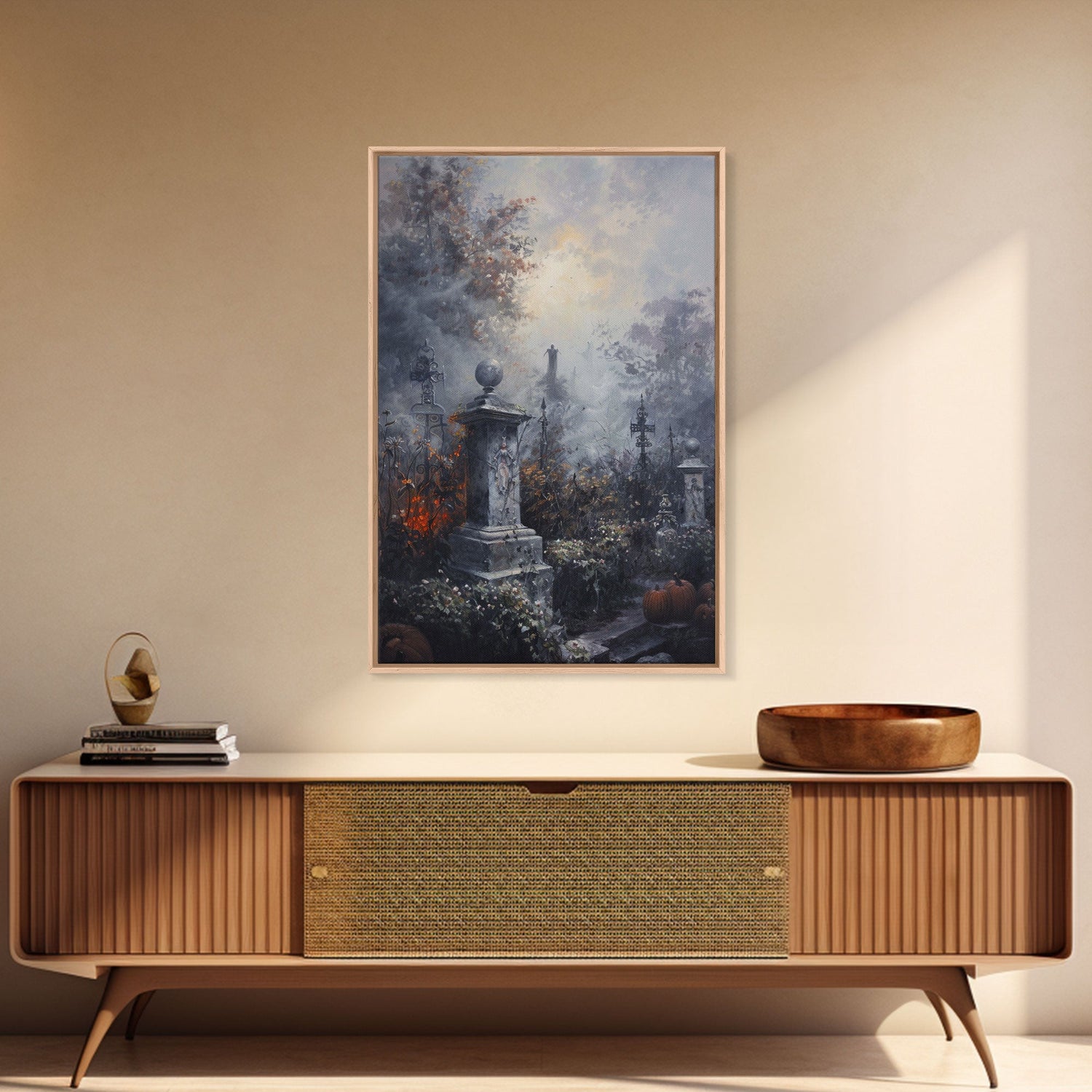 Gothic Cemetery with Statues Framed Canvas Print, Halloween Wall Art, Haunted Graveyard, Home Decor, Spooky Art, Living Room Decor, Gothic