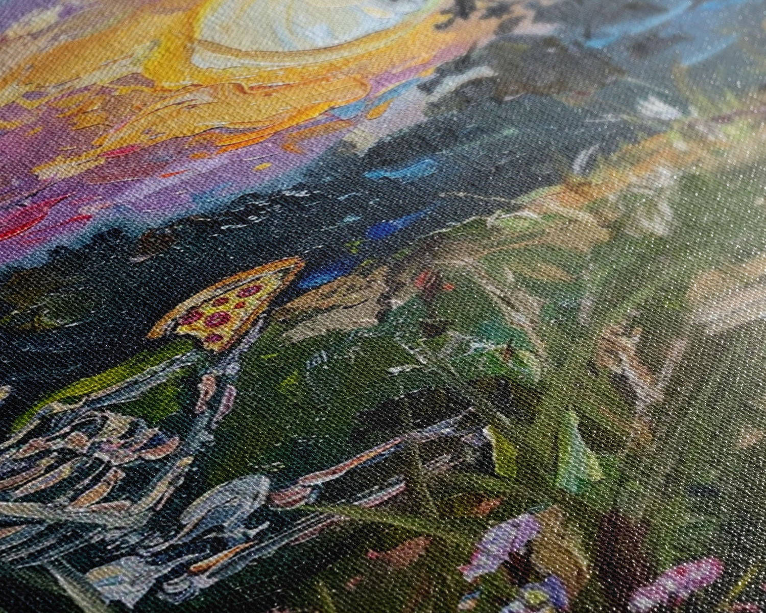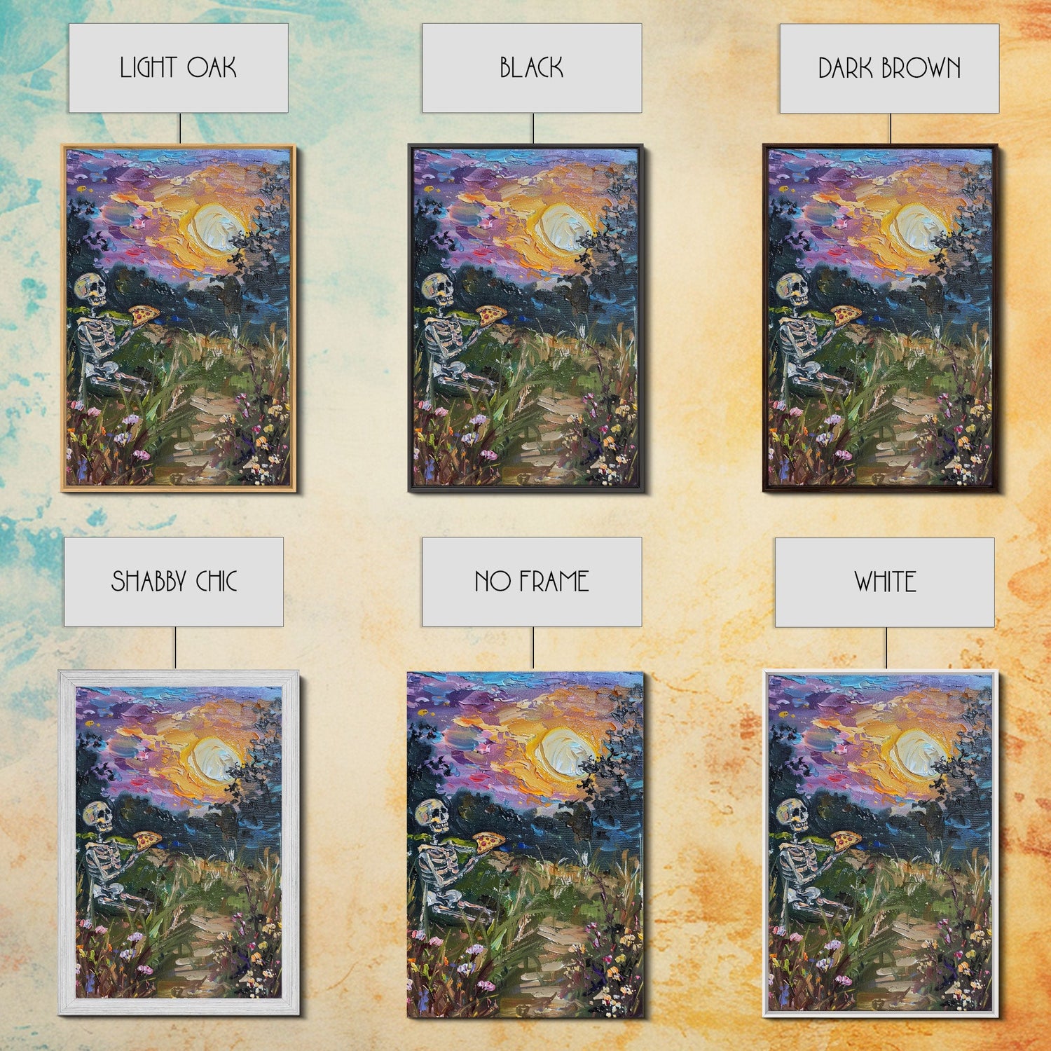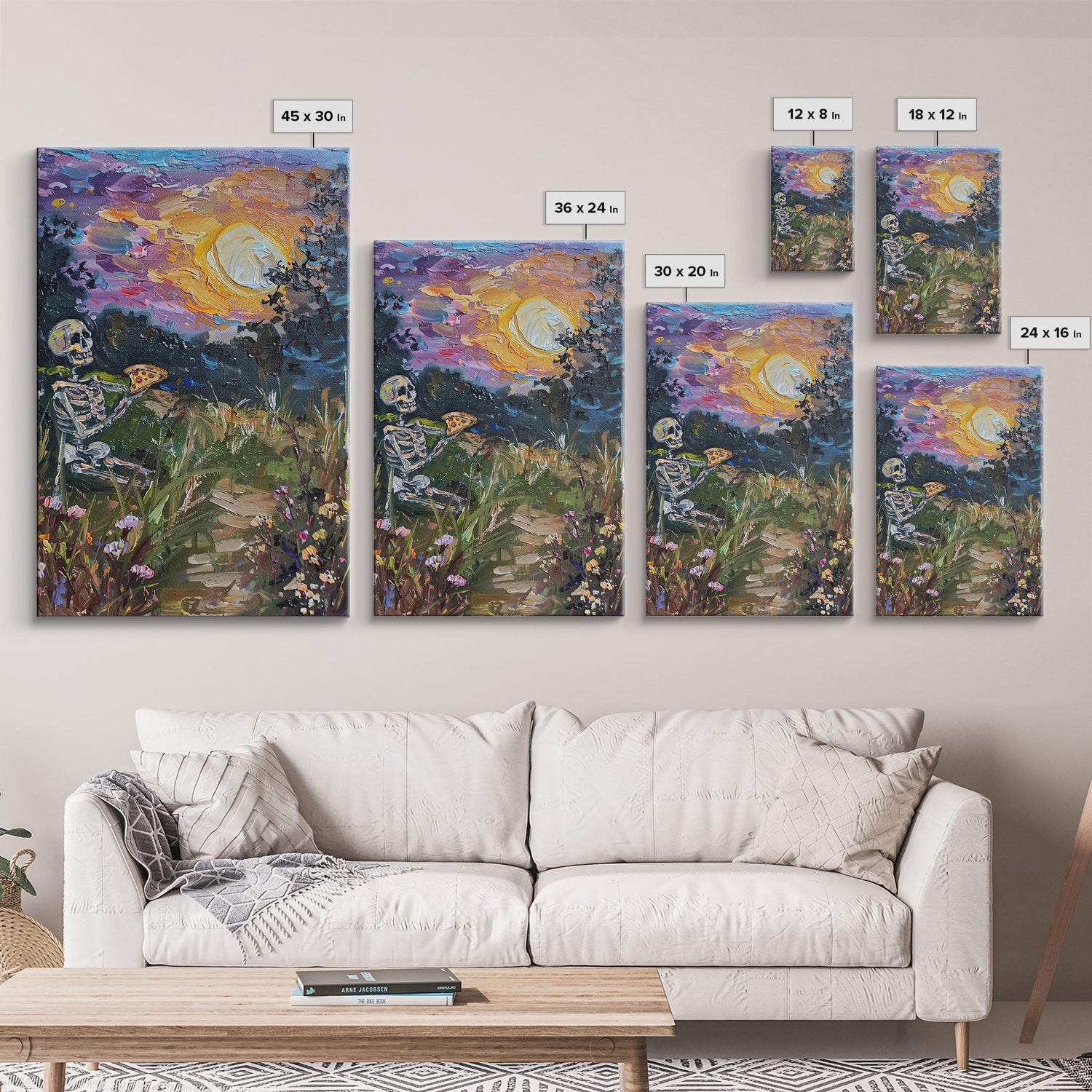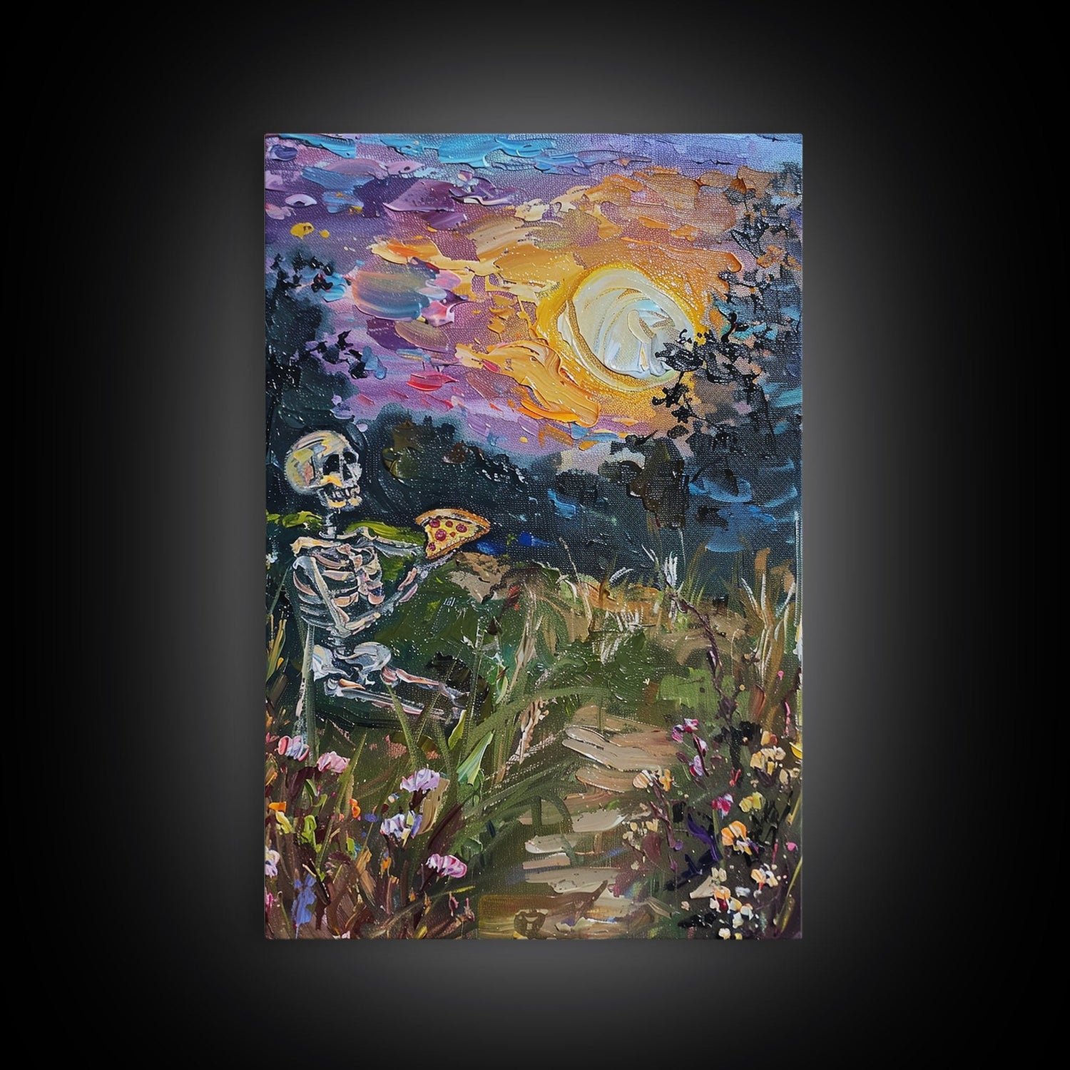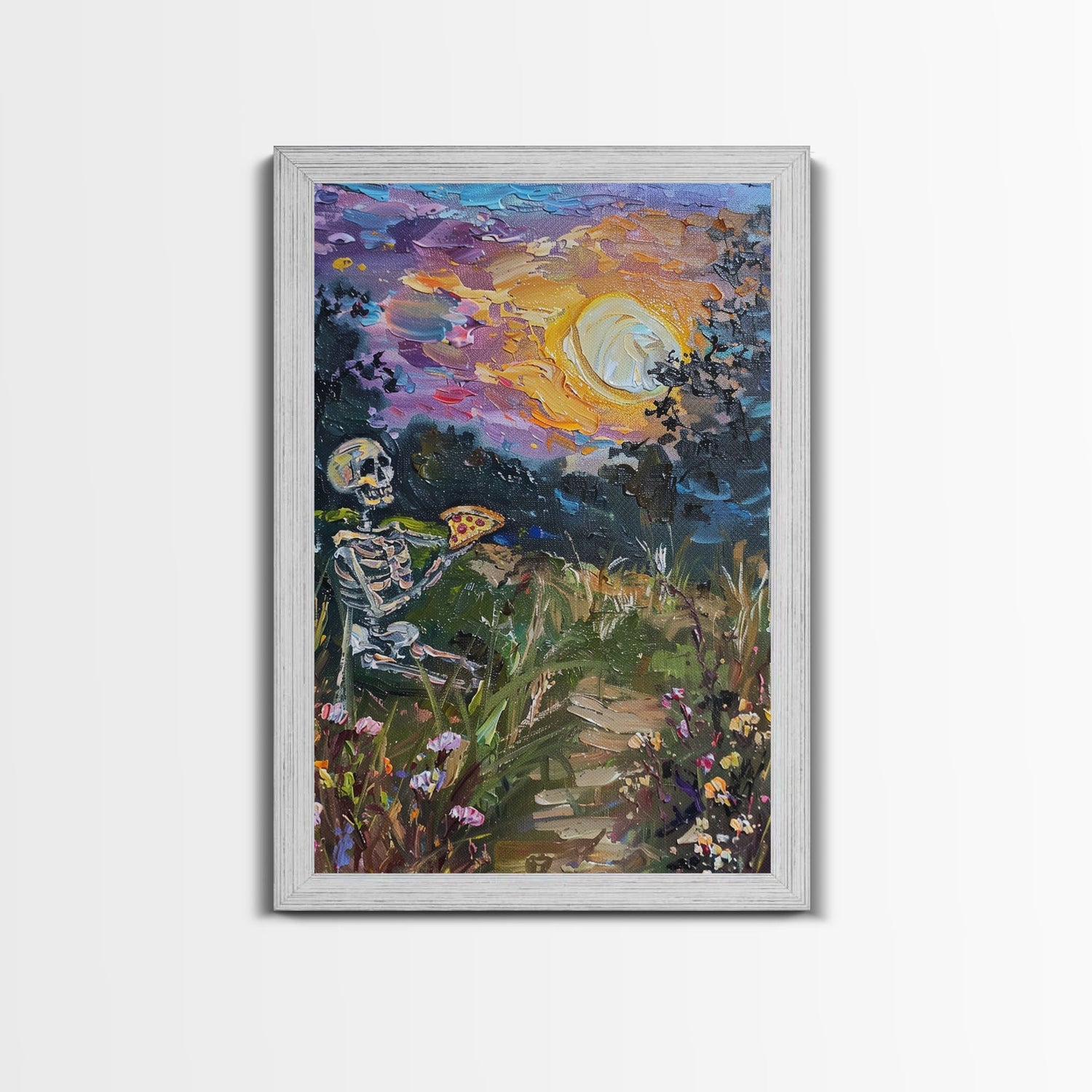 Graveyard Pizza Party Framed Canvas print, Skeleton Eating Pizza In a Cemetary Halloween Decor - 8x12 Inches / Gallery Wrap Canvas - Ready To Hang is backordered and will ship as soon as it is back in stock.