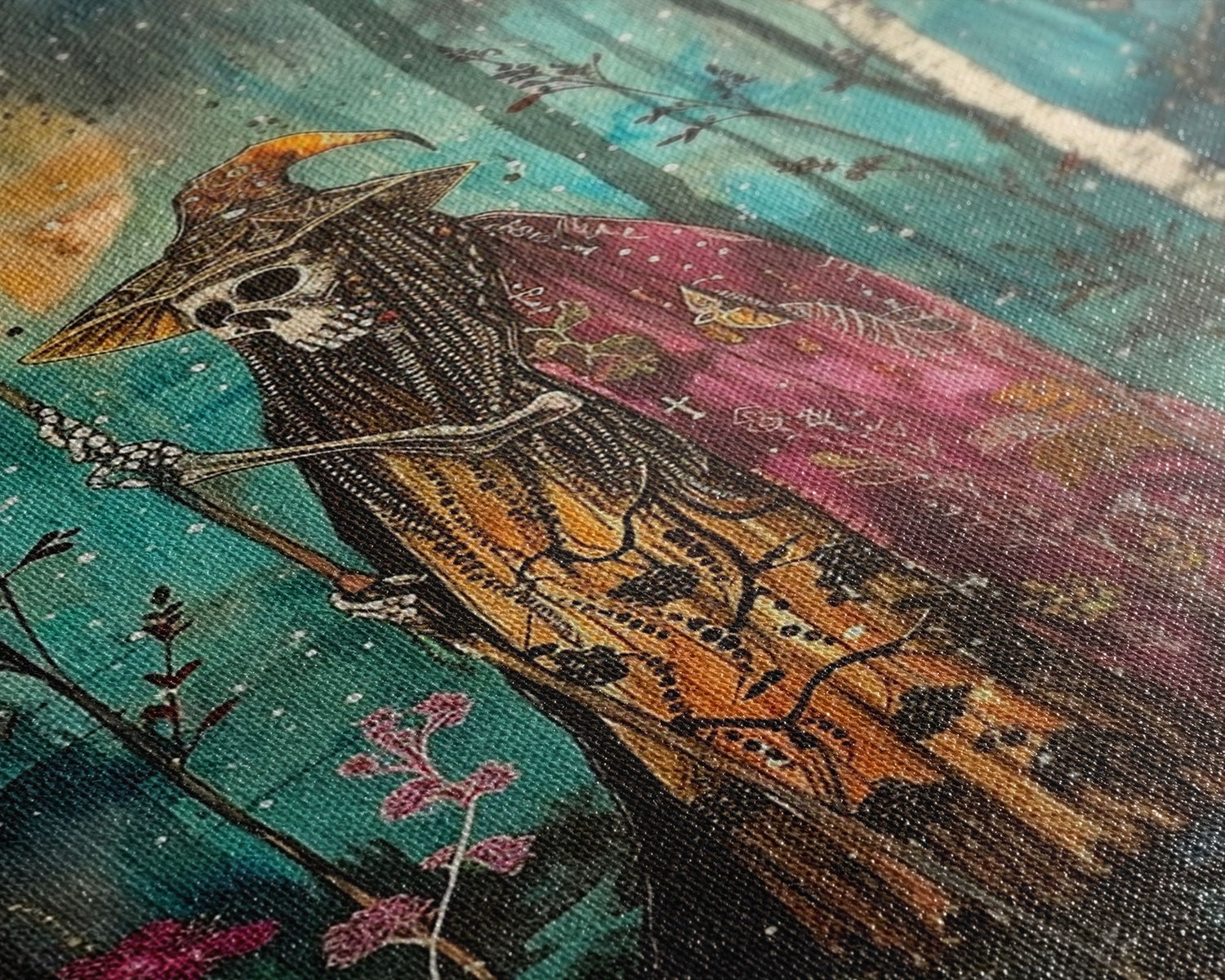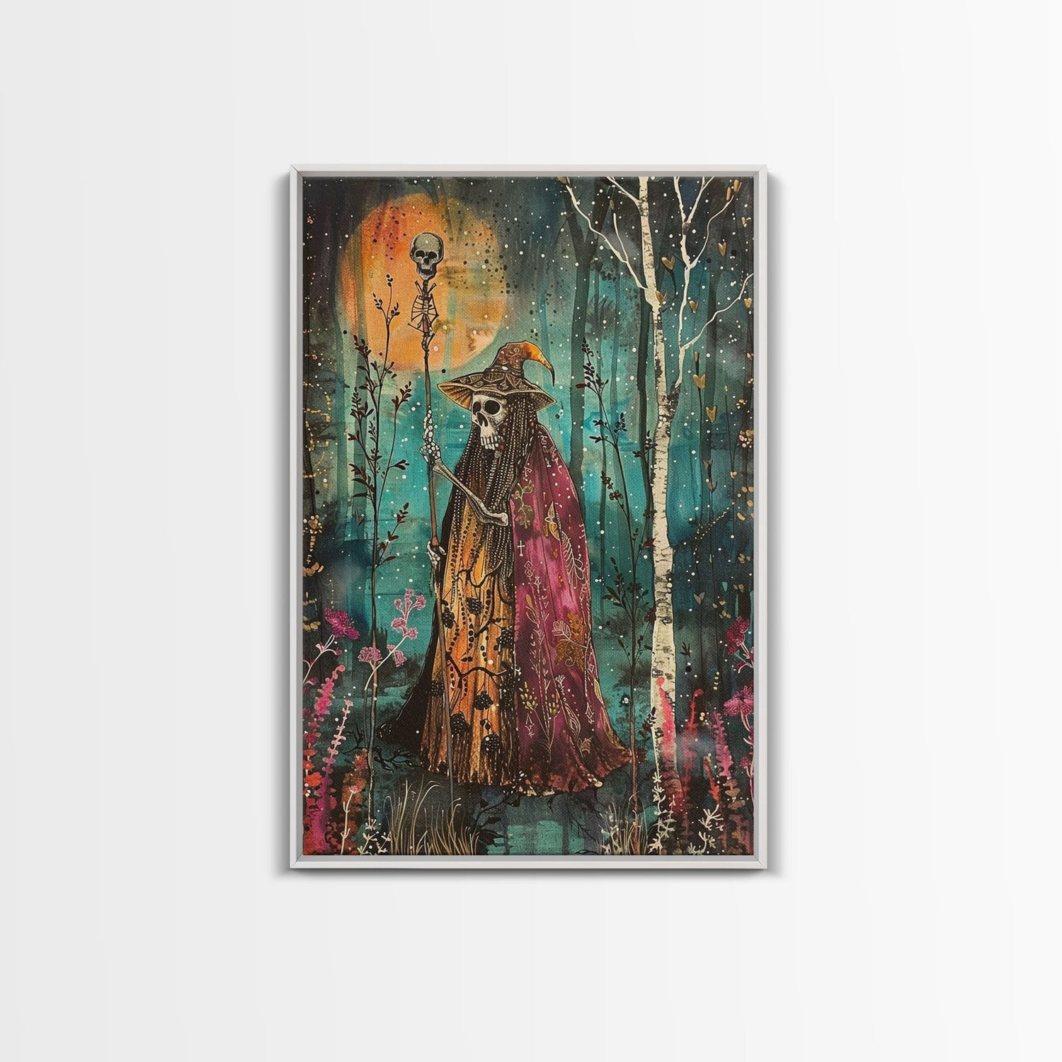 Halloween Skeleton with Spider Webs, Framed Canvas Print, Wall Art, Spooky Decor, Halloween Decoration, Living Room Art, Unique Gift