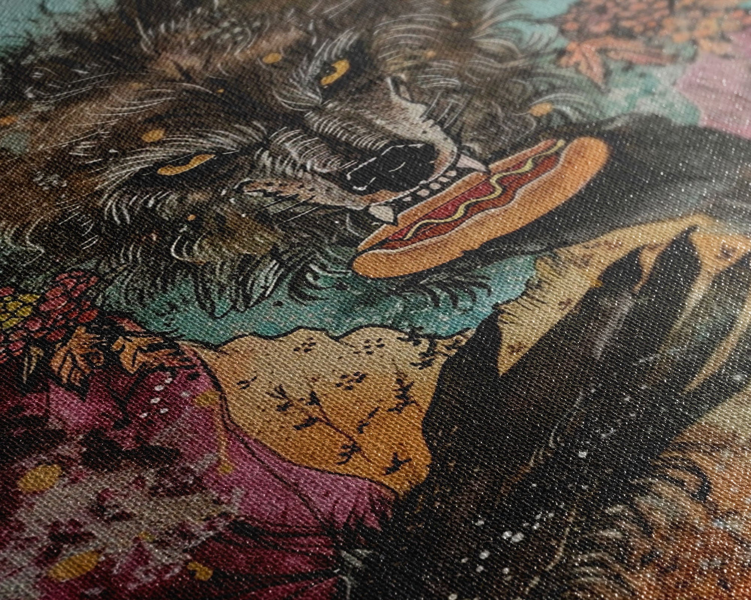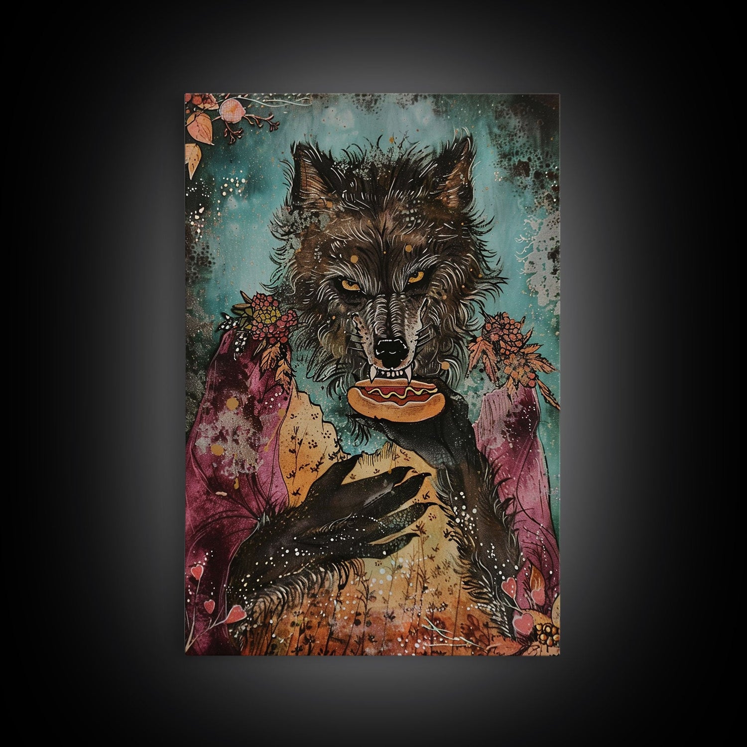 Halloween Werewolf Holding Hotdog, Framed Canvas Print, Wall Art, Home Decor, Spooky Artwork, Fantasy Decor, Halloween Decor
