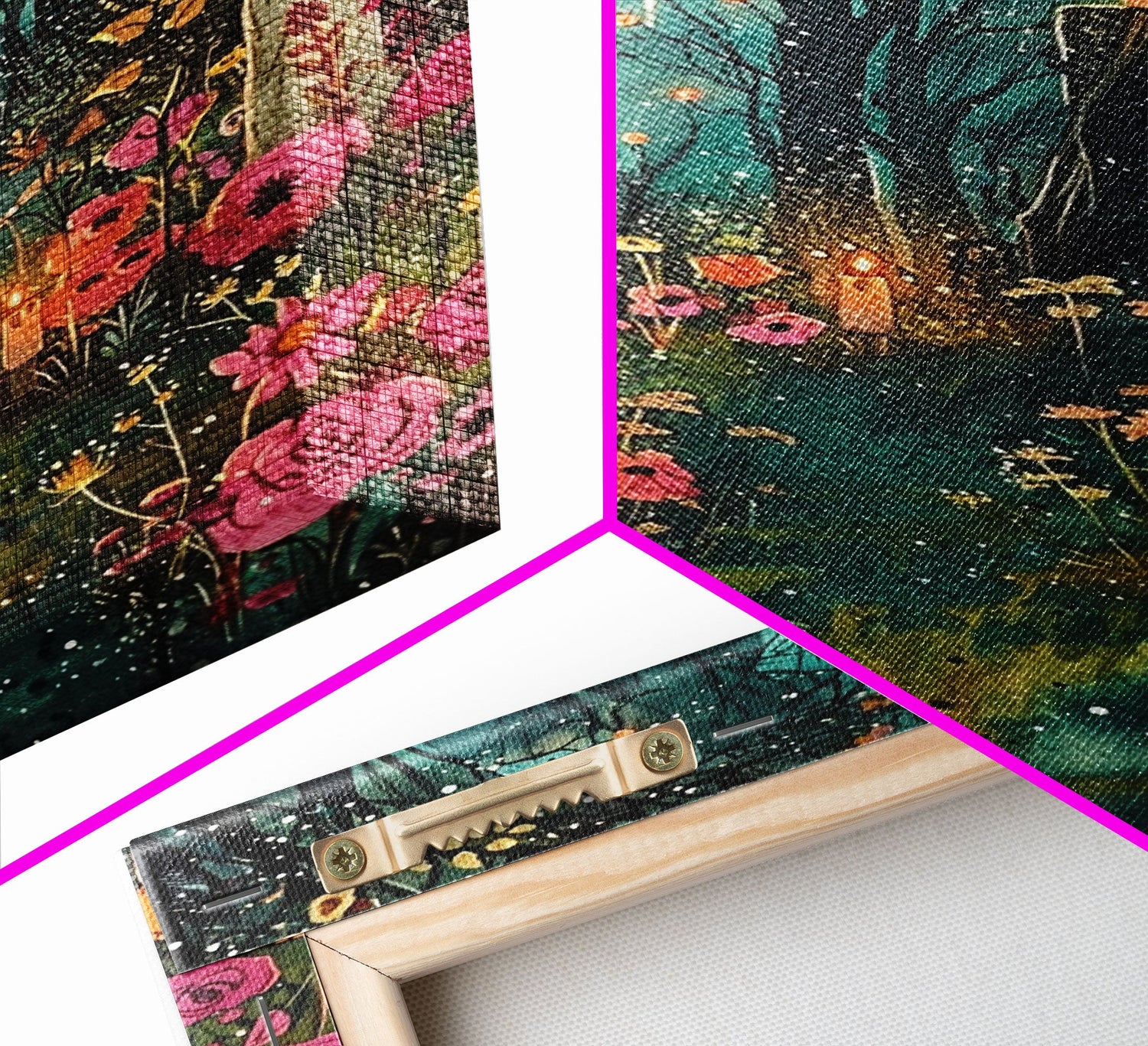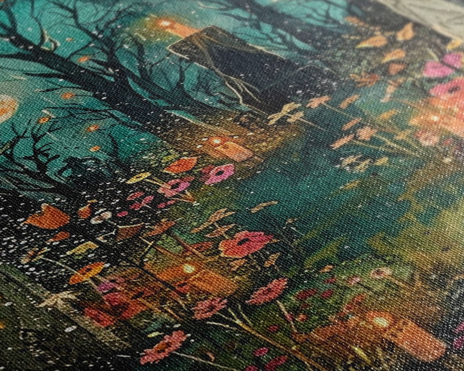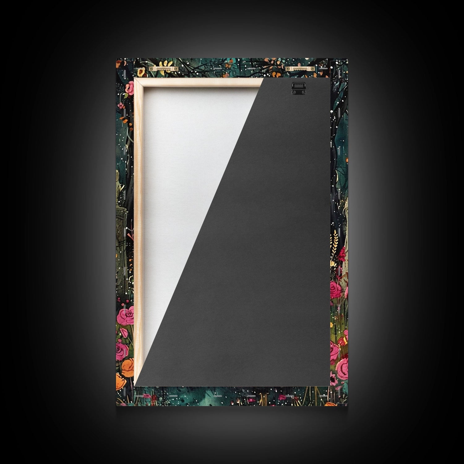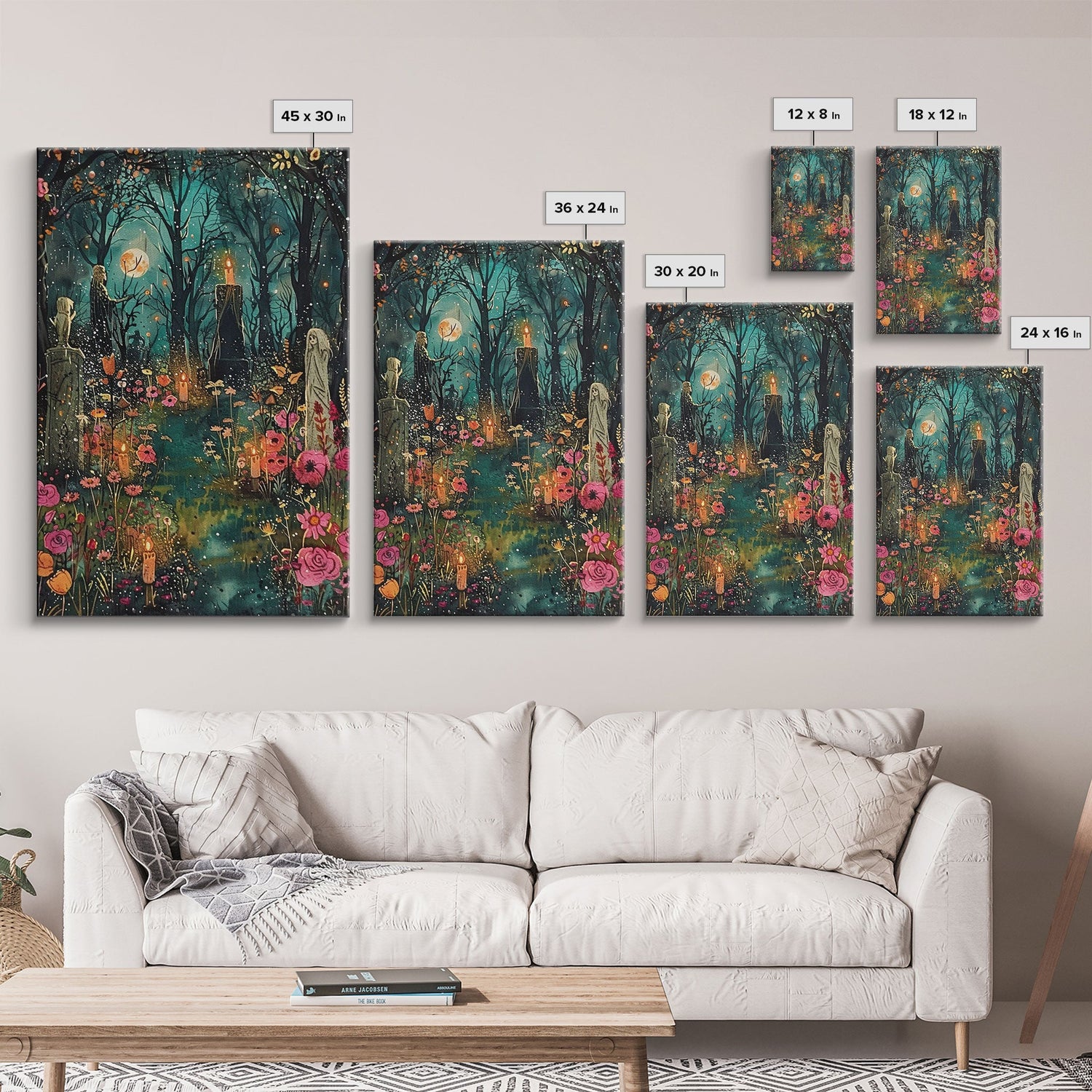 Haunted Graveyard with Flowers Framed Canvas Print, Wall Art, Halloween Cemetery Art, Spooky Home Decor, Ghostly Garden Painting