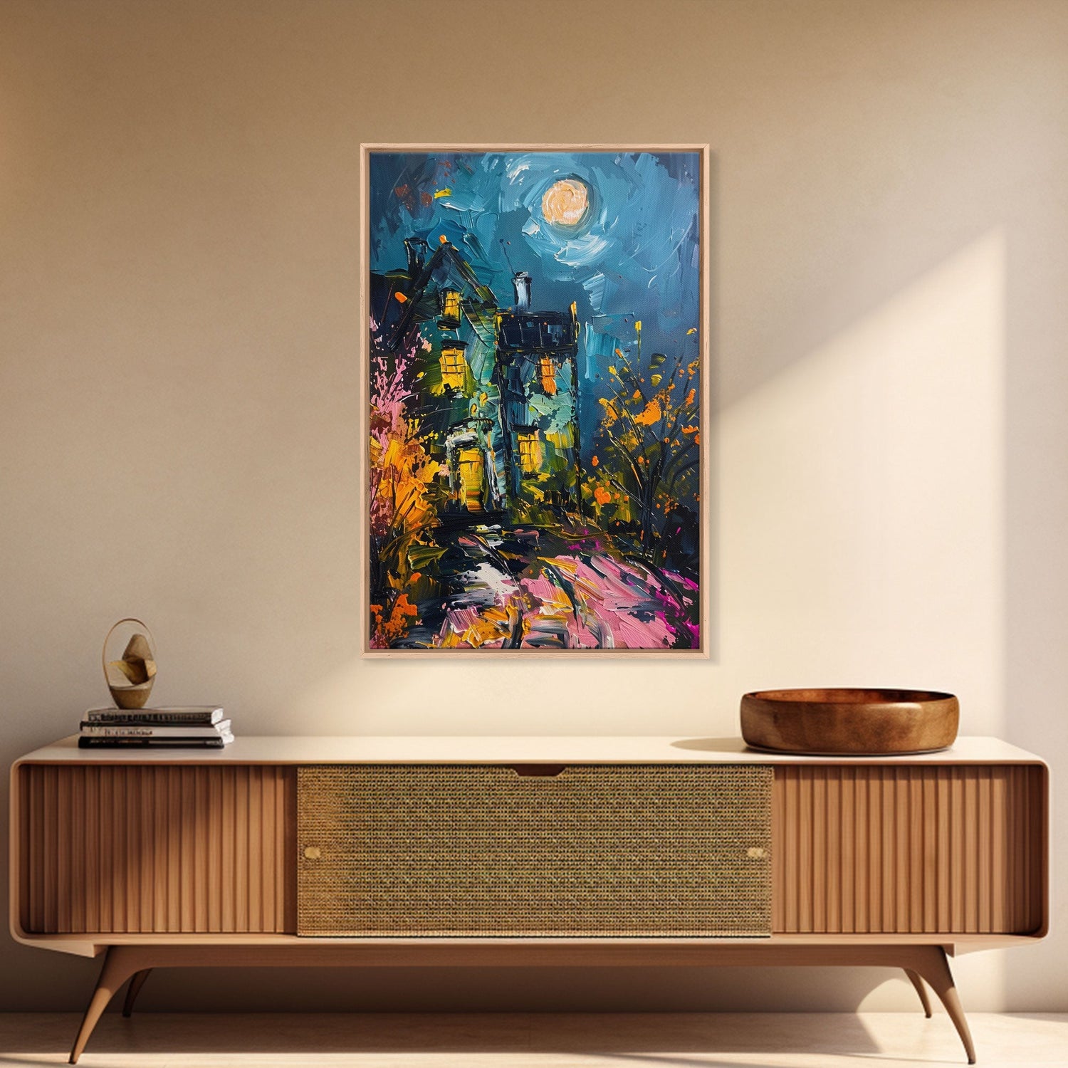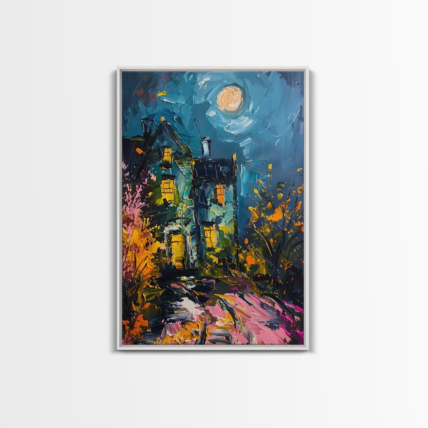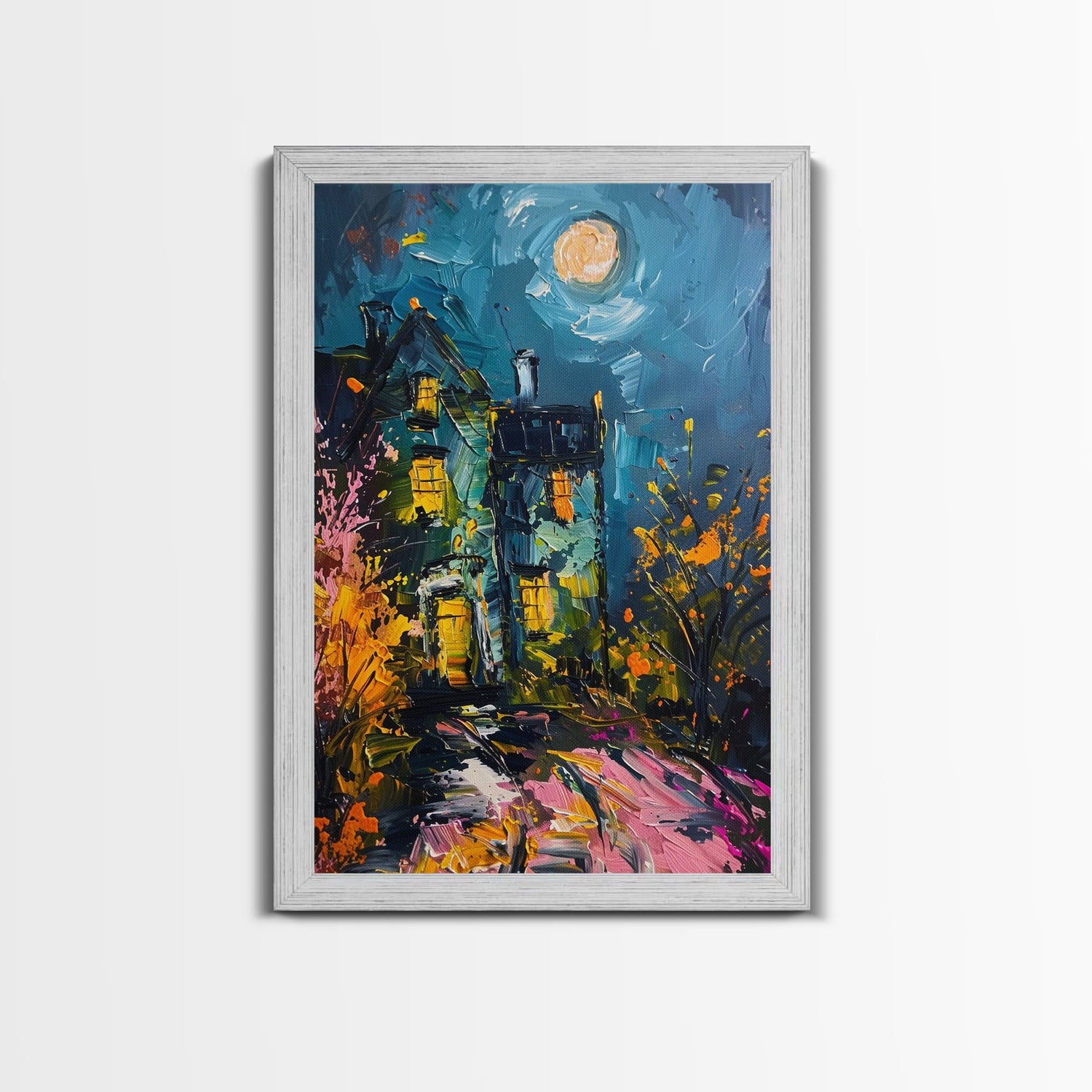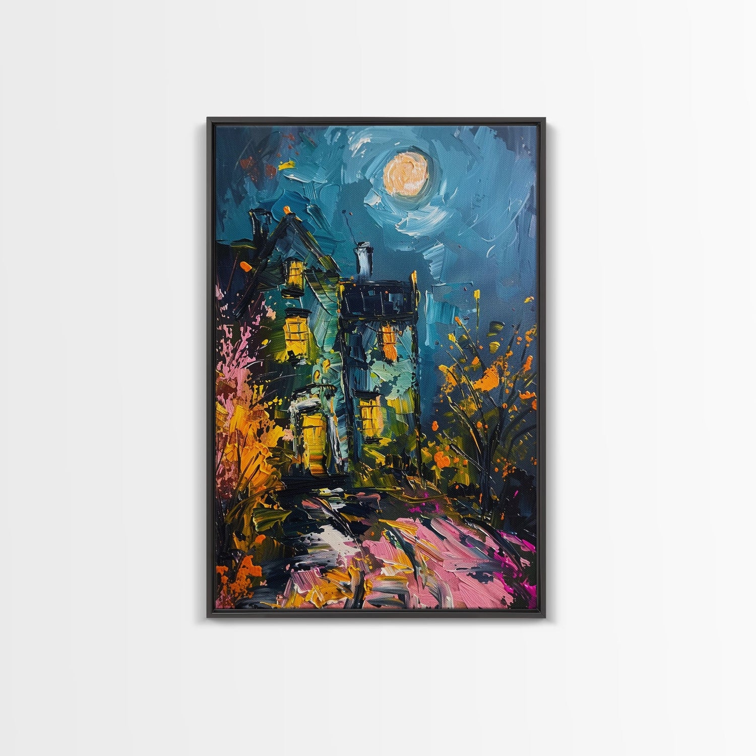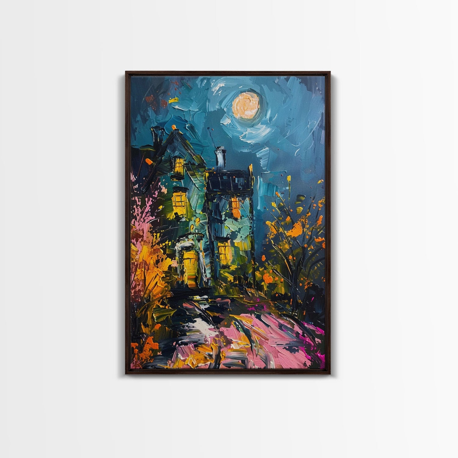 Haunted House with Glowing Windows Framed Canvas Print, Halloween Wall Art, Spooky Art, Home Decor, Living Room Decor, Gothic Artwork