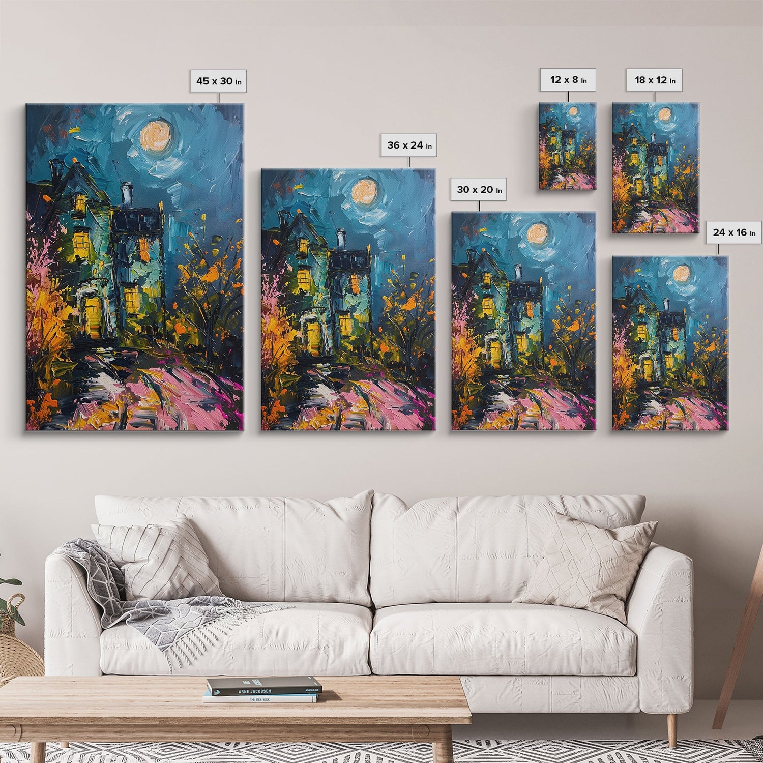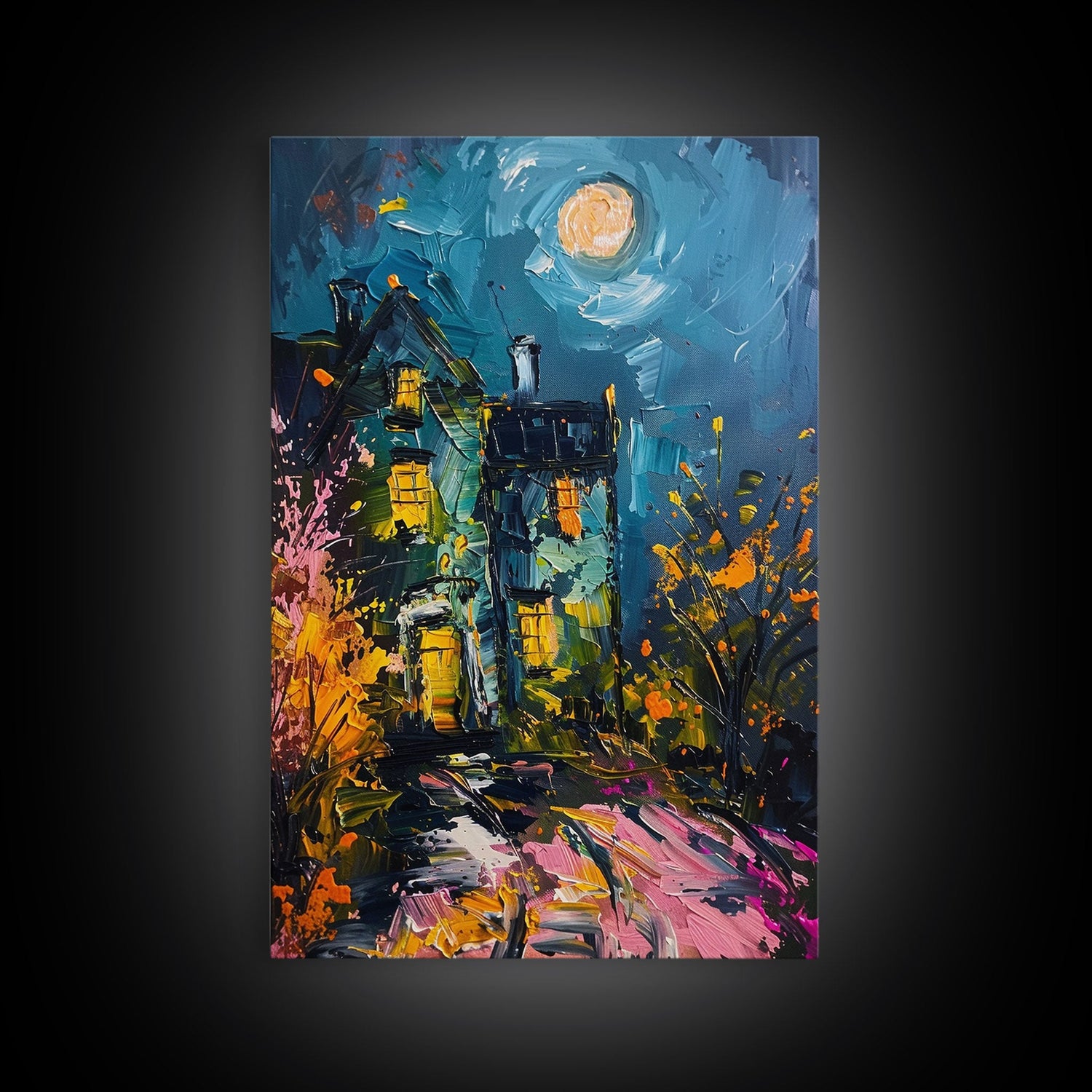 Haunted House with Glowing Windows Framed Canvas Print, Halloween Wall Art, Spooky Art, Home Decor, Living Room Decor, Gothic Artwork - 8x12 Inches / Gallery Wrap Canvas - Ready To Hang is backordered and will ship as soon as it is back in stock.