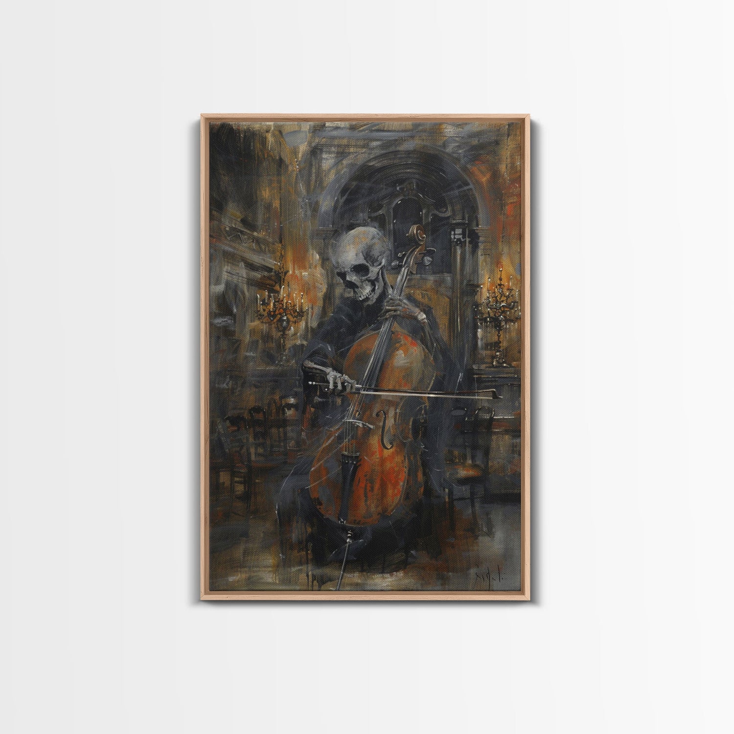 Skeleton Cellist in Gothic Cathedral | Halloween Wall Art | Spooky Home Decor | Creepy Skeleton Musician Painting | Framed Canvas Print