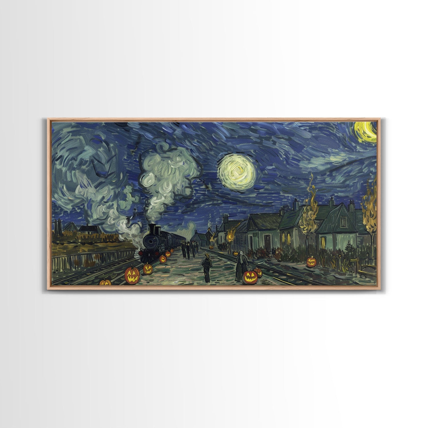 Starry Night Inspired Haunted Steam Train, Framed Canvas Print, Spooky Halloween Wall Art