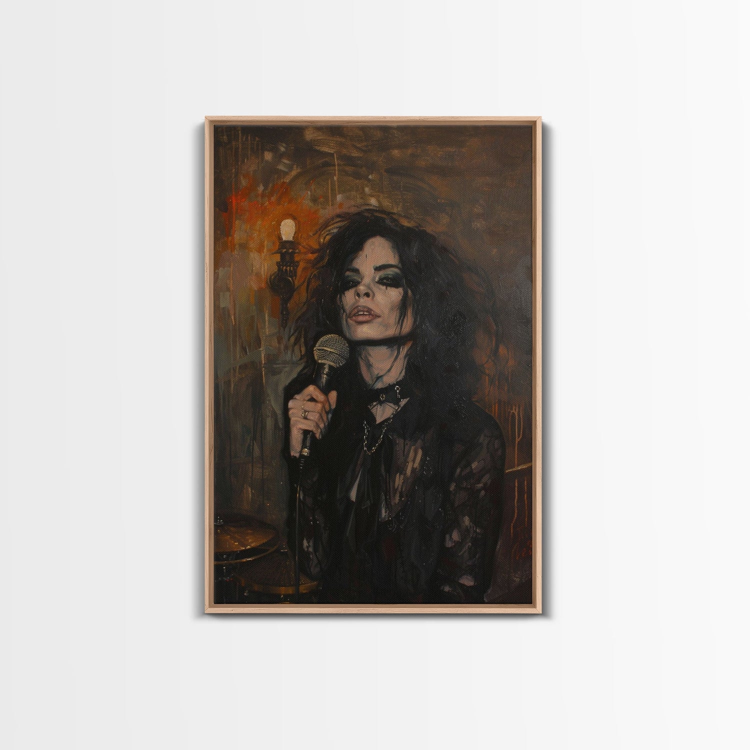 Gothic Singer with Dark Makeup - Halloween Art, Gothic Art, Spooky Decor Haunted Concert Dark Music Art, Eerie Portrait, Framed Canvas Print