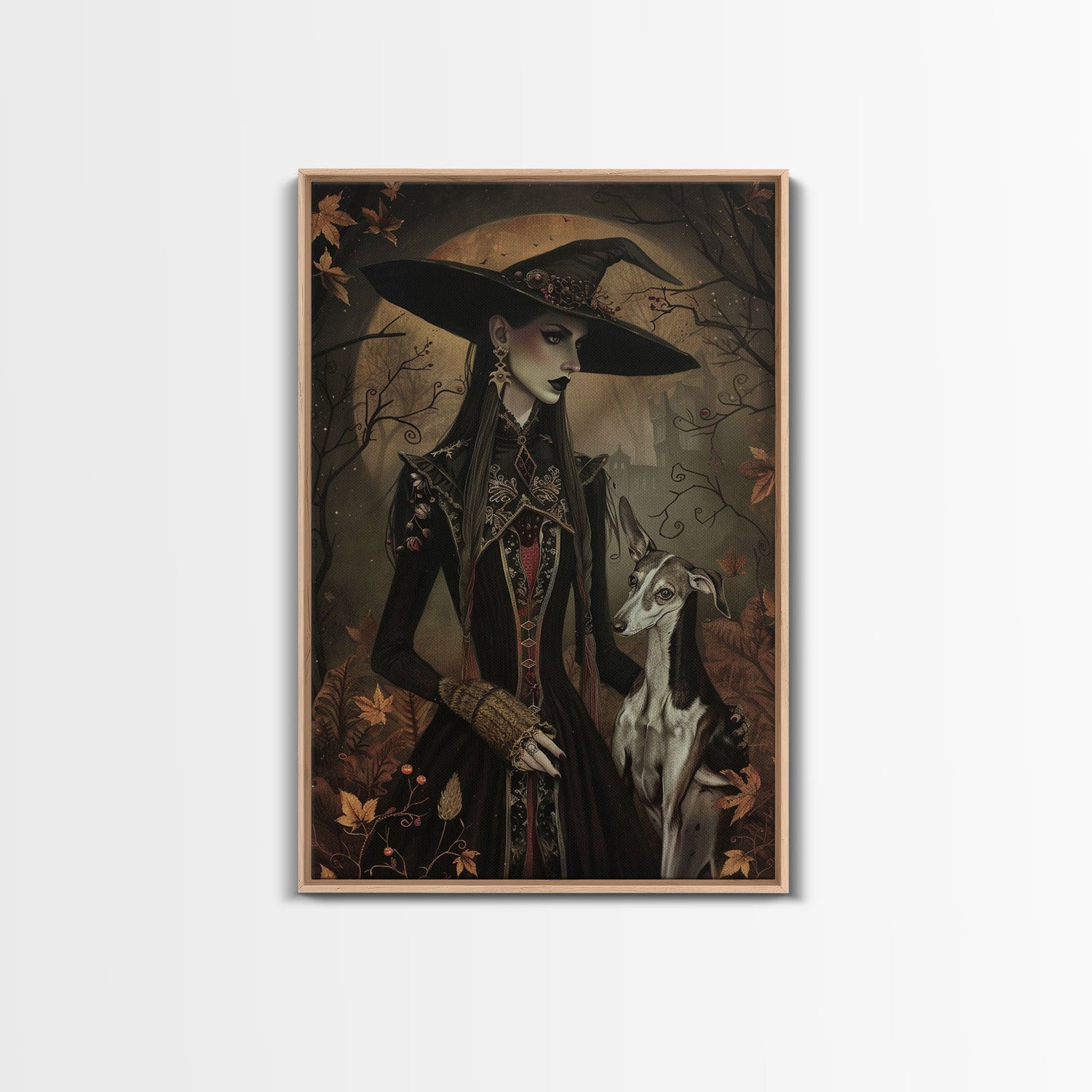 Gothic Witch with Elegant Dog, Framed Canvas Print, Dark Witch Art, Victorian Witch, Halloween Witch Decor, Gothic Home Decor