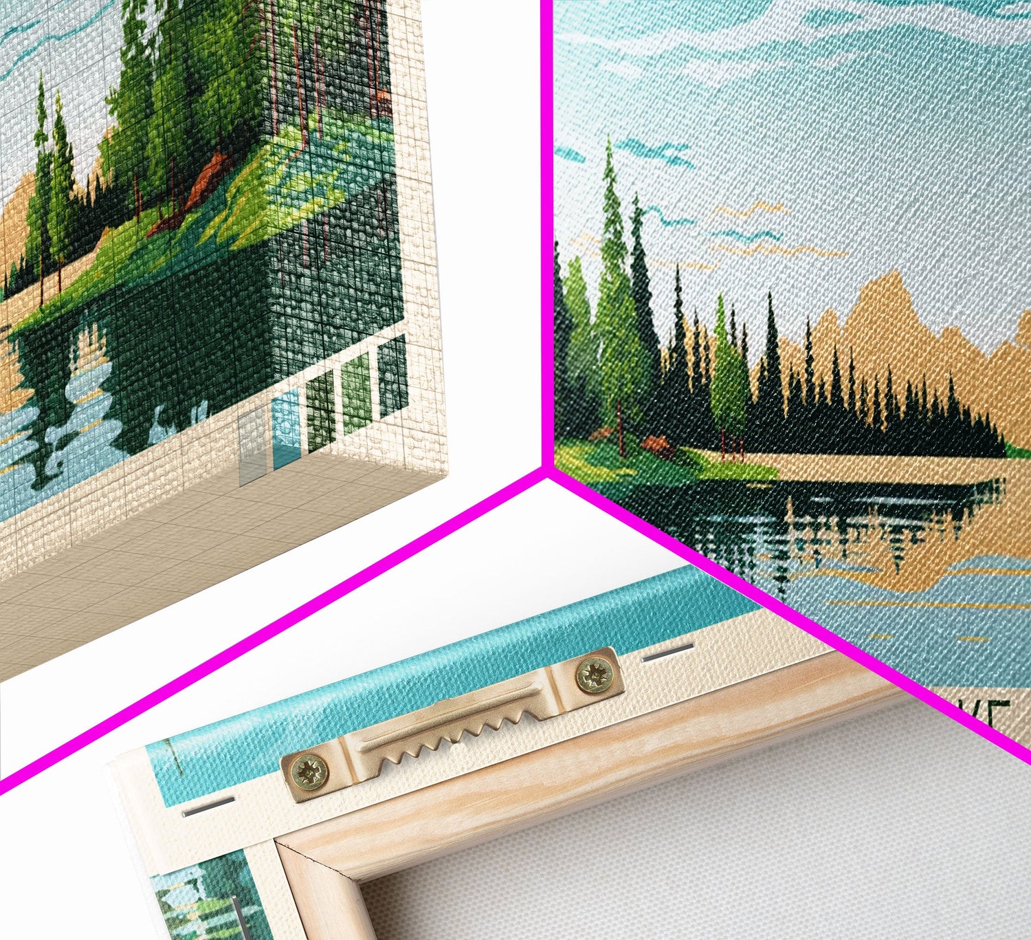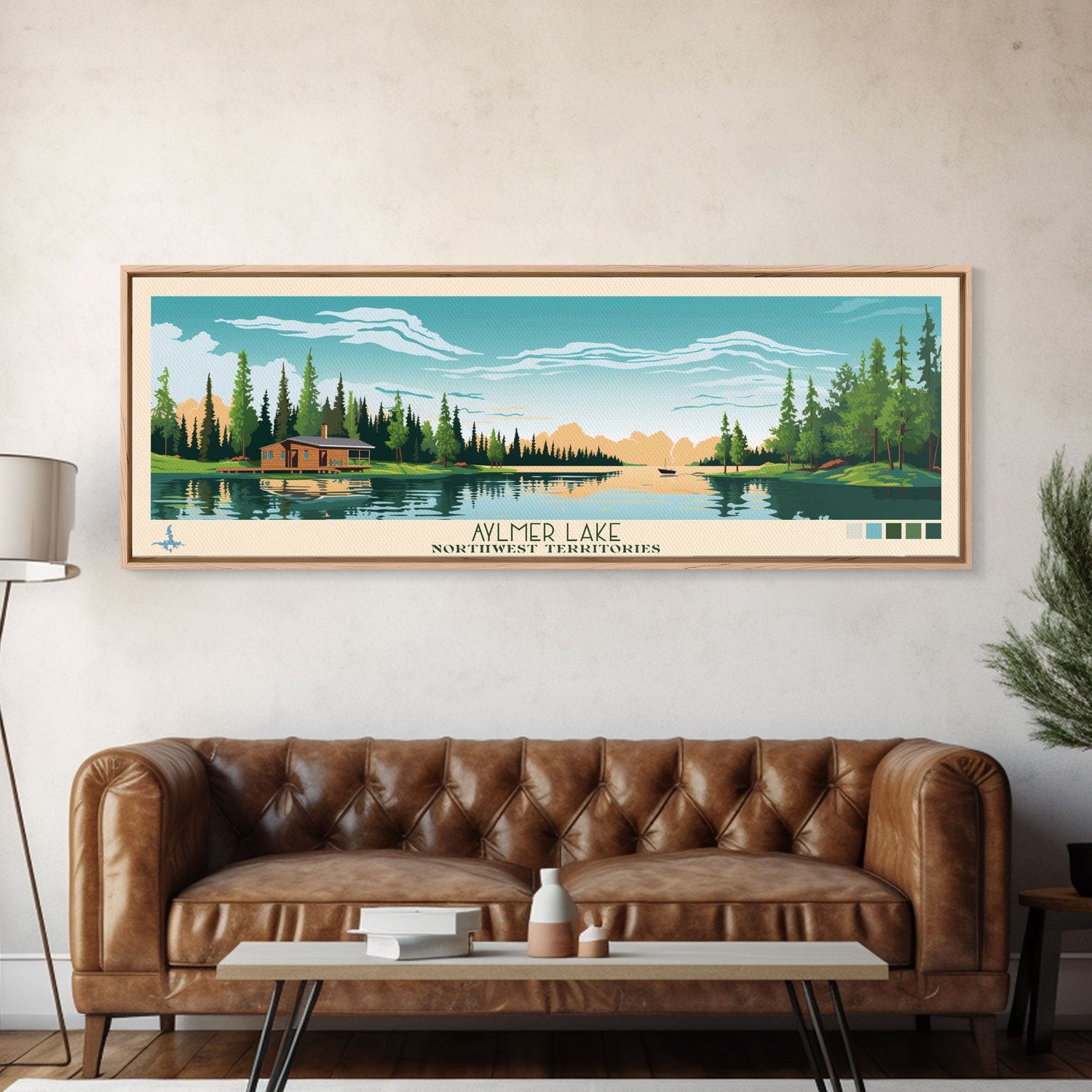 Aylmer Lake Northwest Territories Framed Canvas Print, Panoramic Travel Poster, Midcentury Modern Wall Art, Pop Art, Lake House Decor
