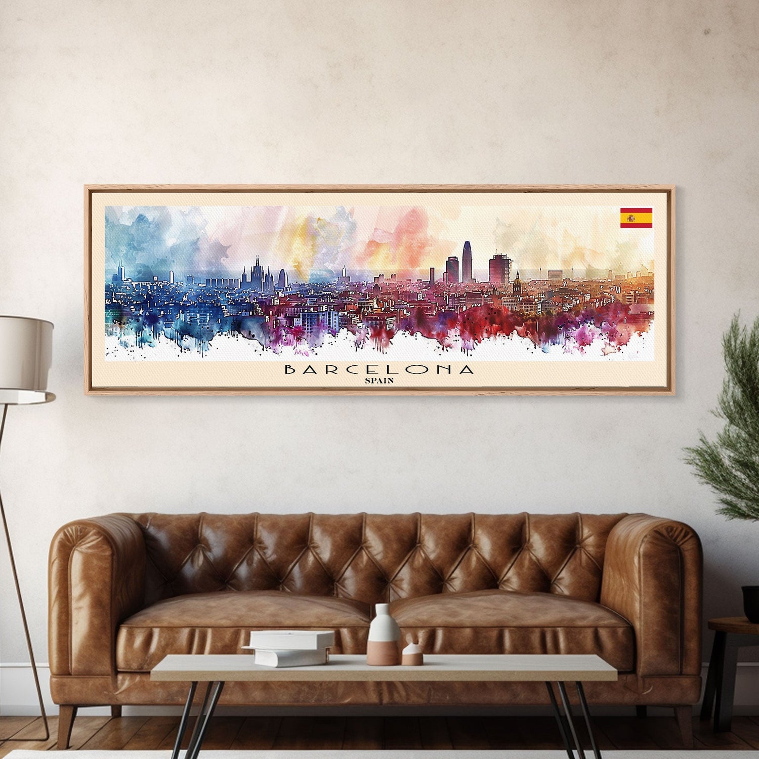 Barcelona Spain Travel Art, City Art, Framed Canvas Print or Metal Wall Art, Europe Travel Poster, Panoramic Wall Art, Extra Wide Wall Art - 10x30 Inches / No Frame - Stretched Canvas Only is backordered and will ship as soon as it is back in stock.
