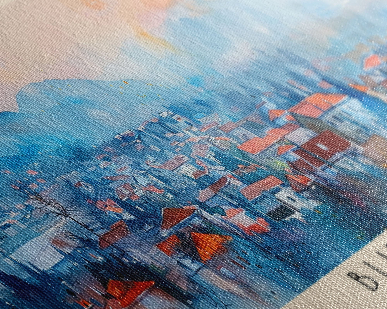 Most of our canvases are made in the USA, with the exception of canvases ordered with the light oak unstained frames, and any large canvases (24x48, 30x60, 16x48 and 20x60) ordered WITH a frame. These are temporarily made in and shipped from Europe, while we try to find a more consistent supplier in the USA.