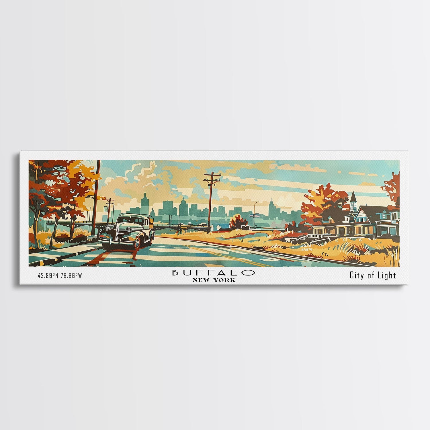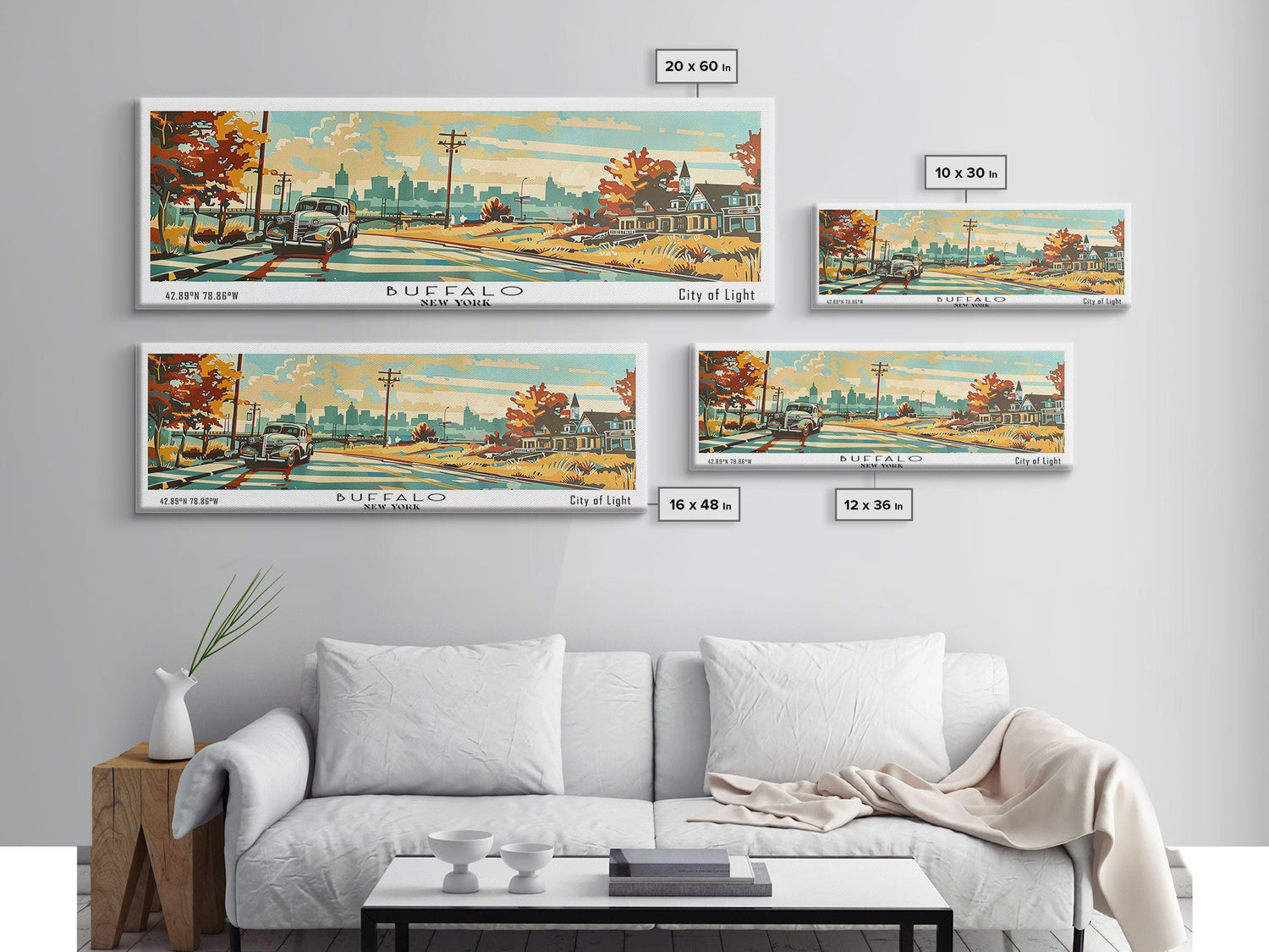 Buffalo New York Panoramic Painting, Mid Century Modern Framed Canvas Print, Retro Pop Art Travel Poster, Wall Decor, Home Decor, Wall Hanging - 10x30 Inches / No Frame - Stretched Canvas Only is backordered and will ship as soon as it is back in stock.