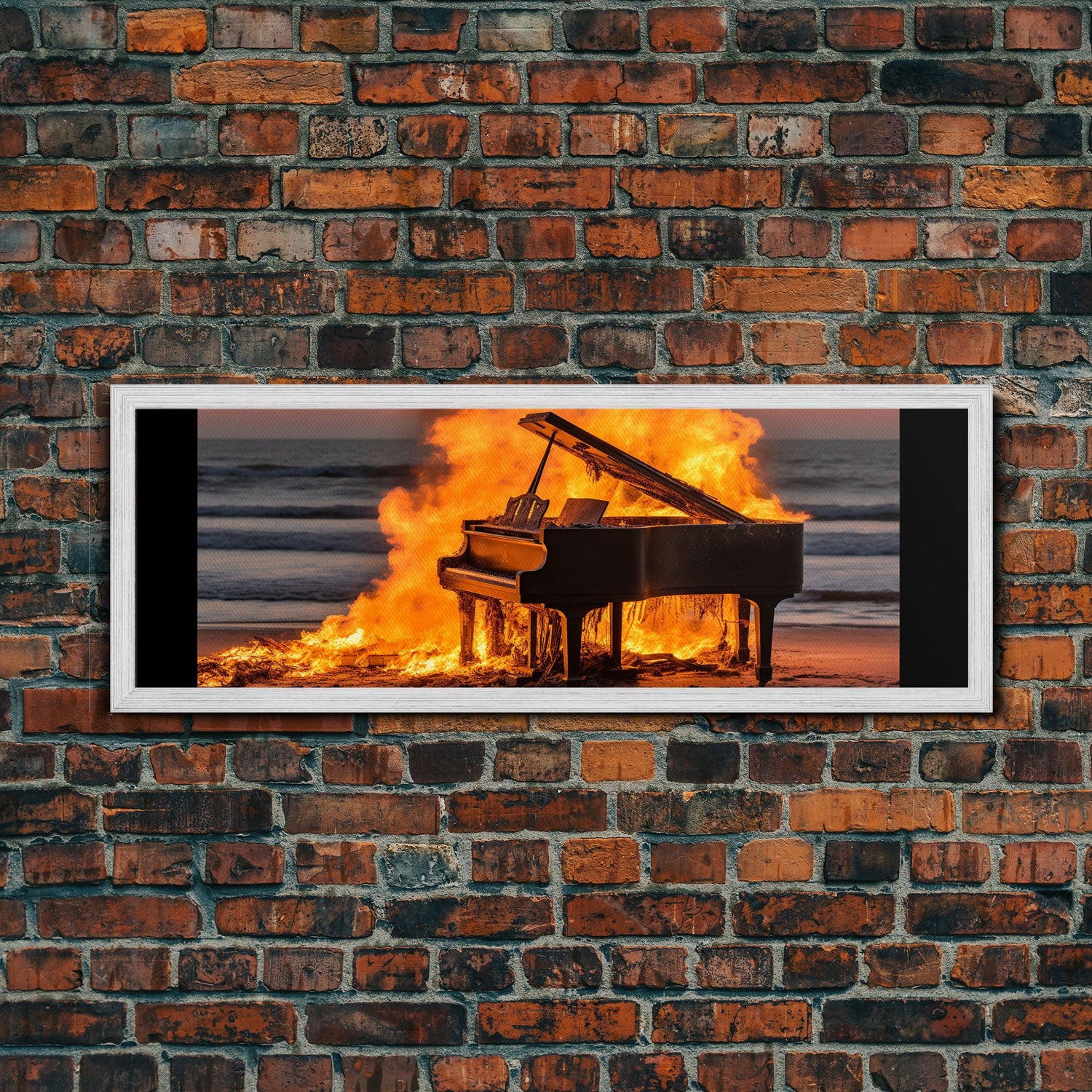 Burning Piano On The Beach, Surreal Art, Framed Canvas Print, Panoramic Wall Art