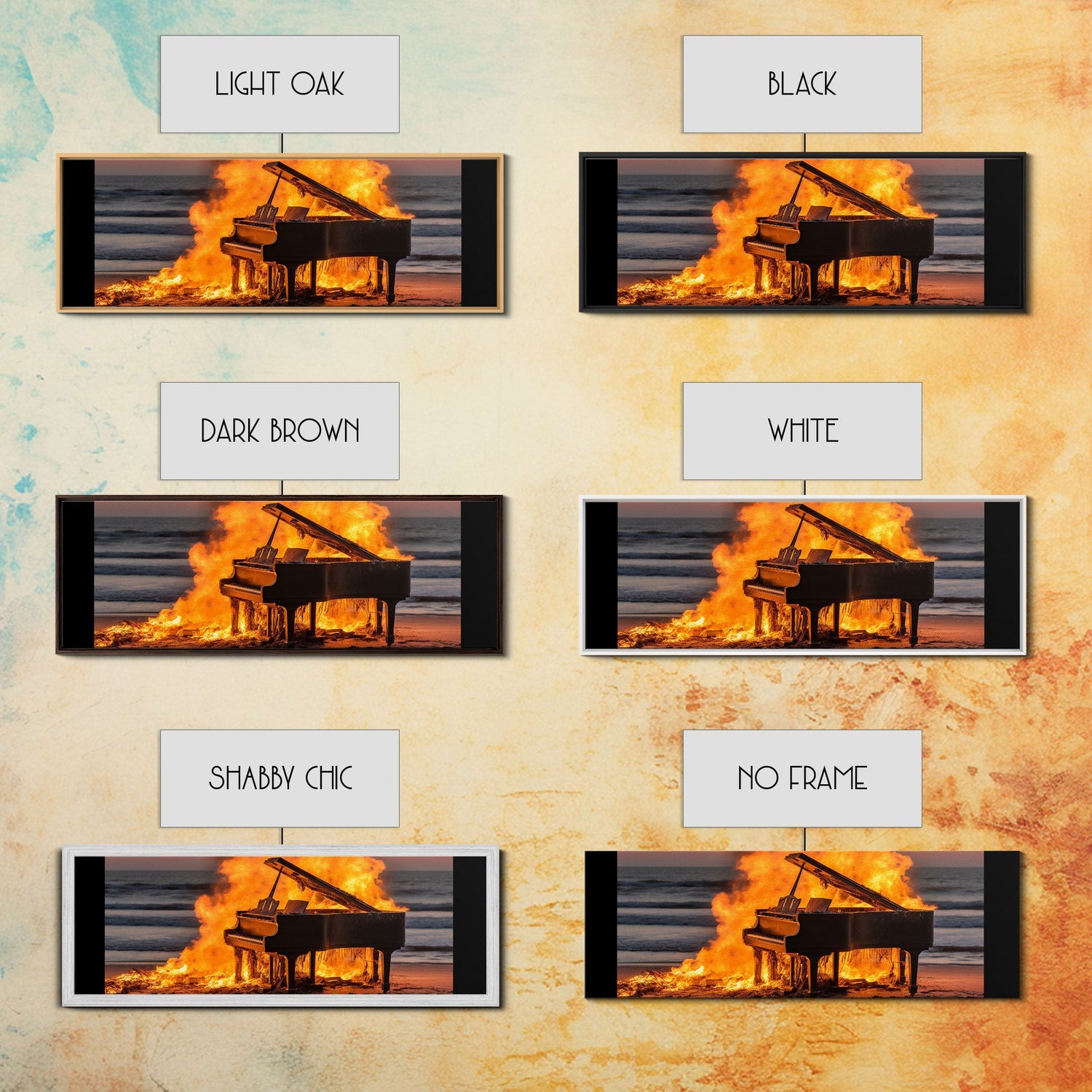 Burning Piano On The Beach, Surreal Art, Framed Canvas Print, Panoramic Wall Art - 10x30 Inches / No Frame - Stretched Canvas Only is backordered and will ship as soon as it is back in stock.