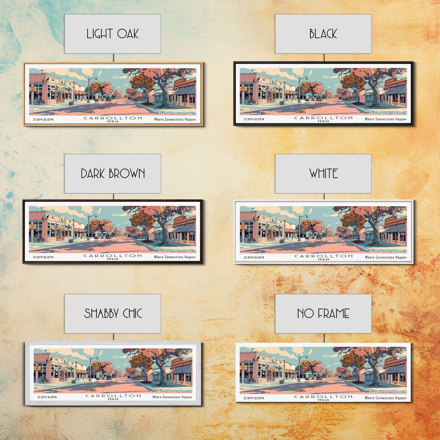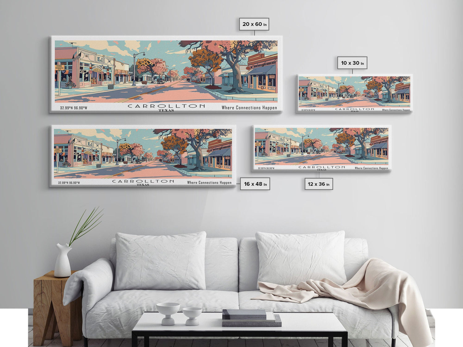 Carrollton Texas Panoramic Painting, Mid Century Modern Framed Canvas Print, Retro Pop Art Travel Poster, Office Wall Art, City Print - 10x30 Inches / No Frame - Stretched Canvas Only is backordered and will ship as soon as it is back in stock.