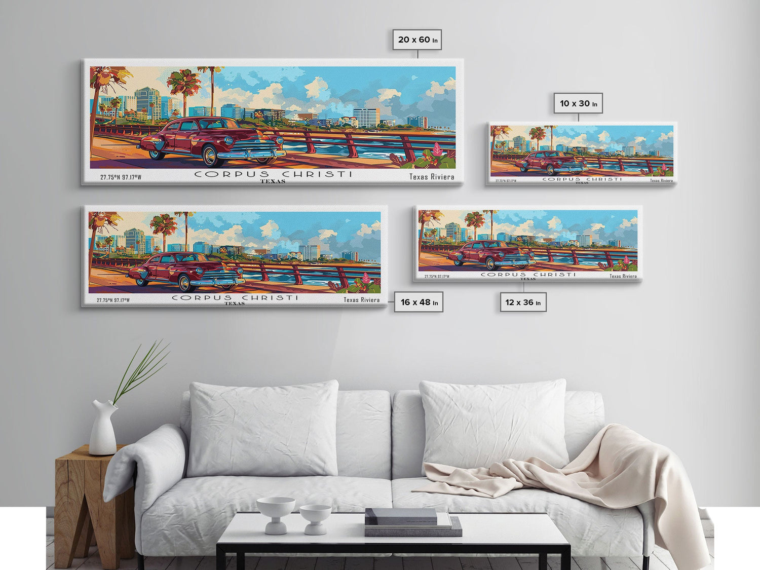 Corpus Christi Texas Panoramic Painting Framed Canvas Print, Mid Century Modern Art, Pop Art Style, Travel Poster, Living Room Decor - 10x30 Inches / No Frame - Stretched Canvas Only is backordered and will ship as soon as it is back in stock.