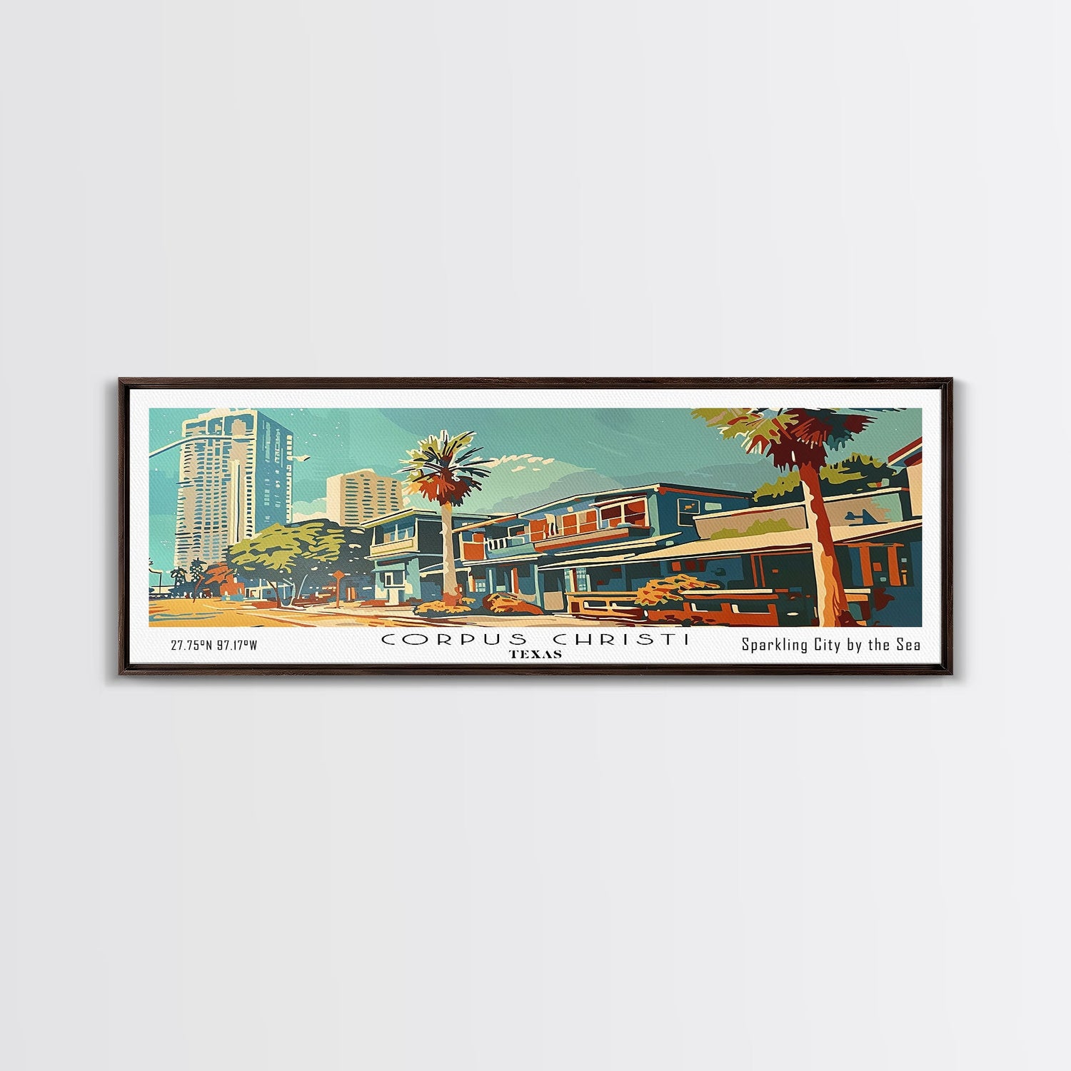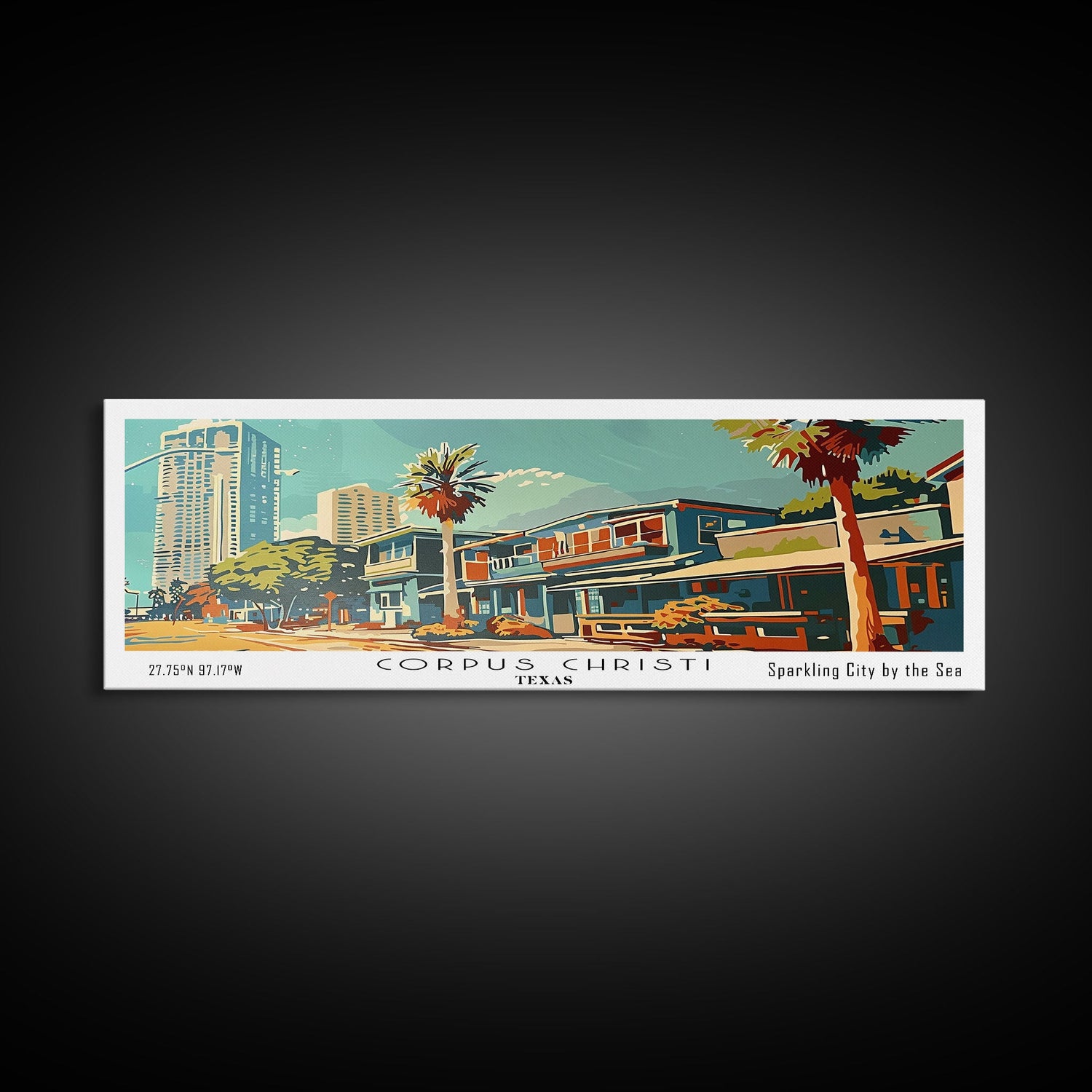 Corpus Christi Texas Panoramic Painting, Mid Century Modern Framed Canvas Print, Retro Pop Art Travel Poster, Wall Decor, Home Decor, Wall Hanging - 10x30 Inches / Gallery Wrap Canvas - Ready To Hang is backordered and will ship as soon as it is back in stock.