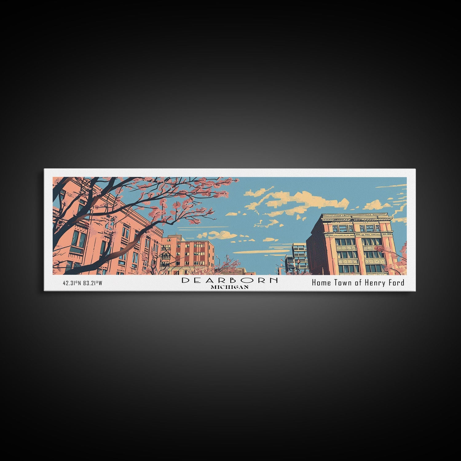 Dearborn Michigan Panoramic Painting, Mid Century Modern Framed Canvas Print, Retro Pop Art Travel Poster, City Wall Decor, Office Wall Art - 10x30 Inches / Gallery Wrap Canvas - Ready To Hang is backordered and will ship as soon as it is back in stock.