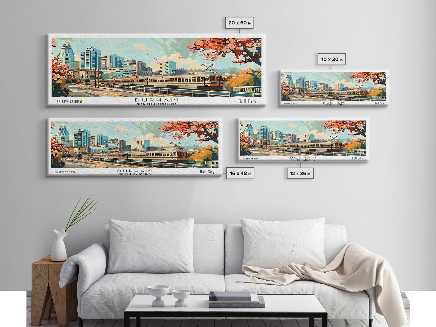 Durham North Carolina Panoramic Painting, Mid Century Modern Framed Canvas Print, Retro Pop Art Travel Poster, Wall Decor, Home Decor, Wall Hanging - 10x30 Inches / No Frame - Stretched Canvas Only is backordered and will ship as soon as it is back in stock.
