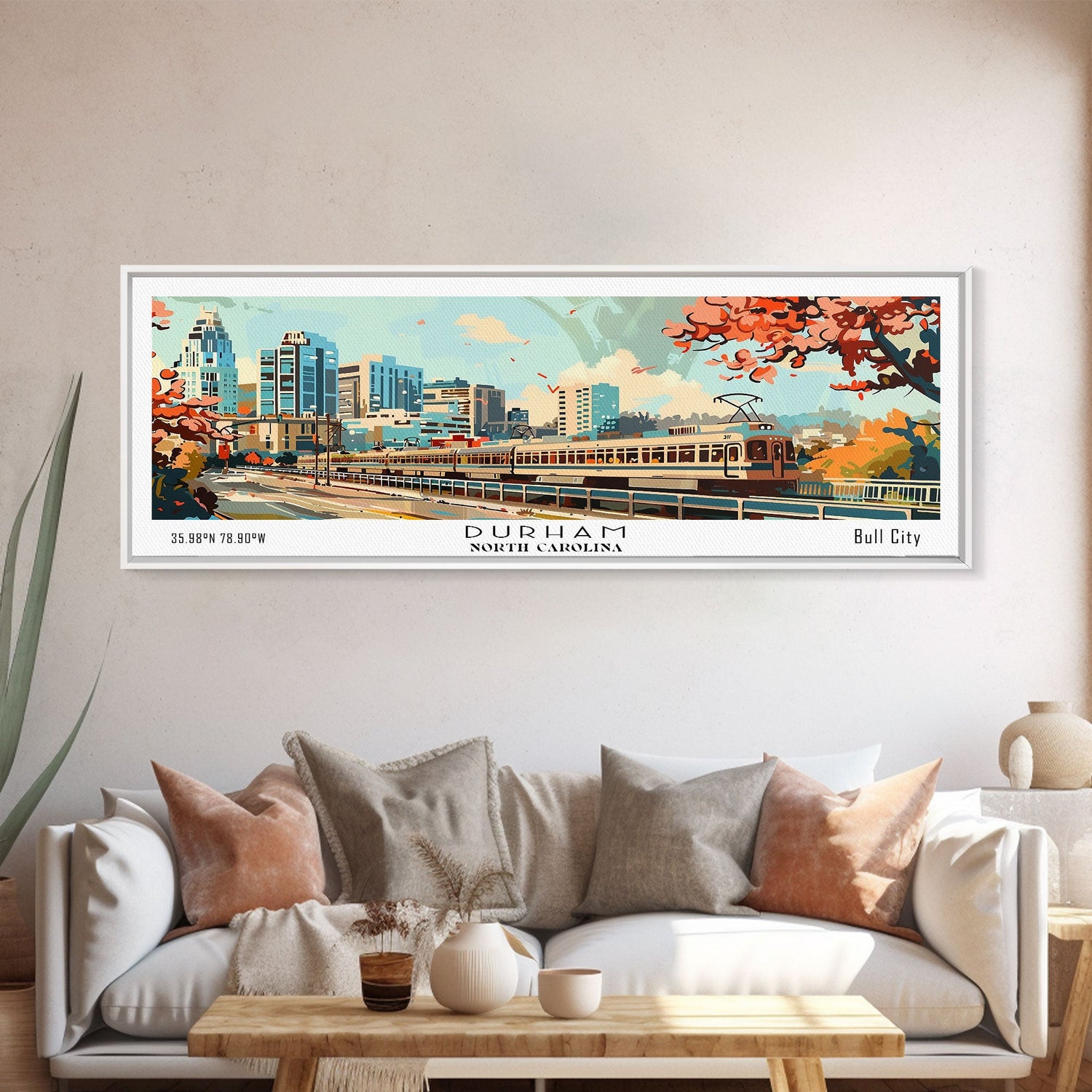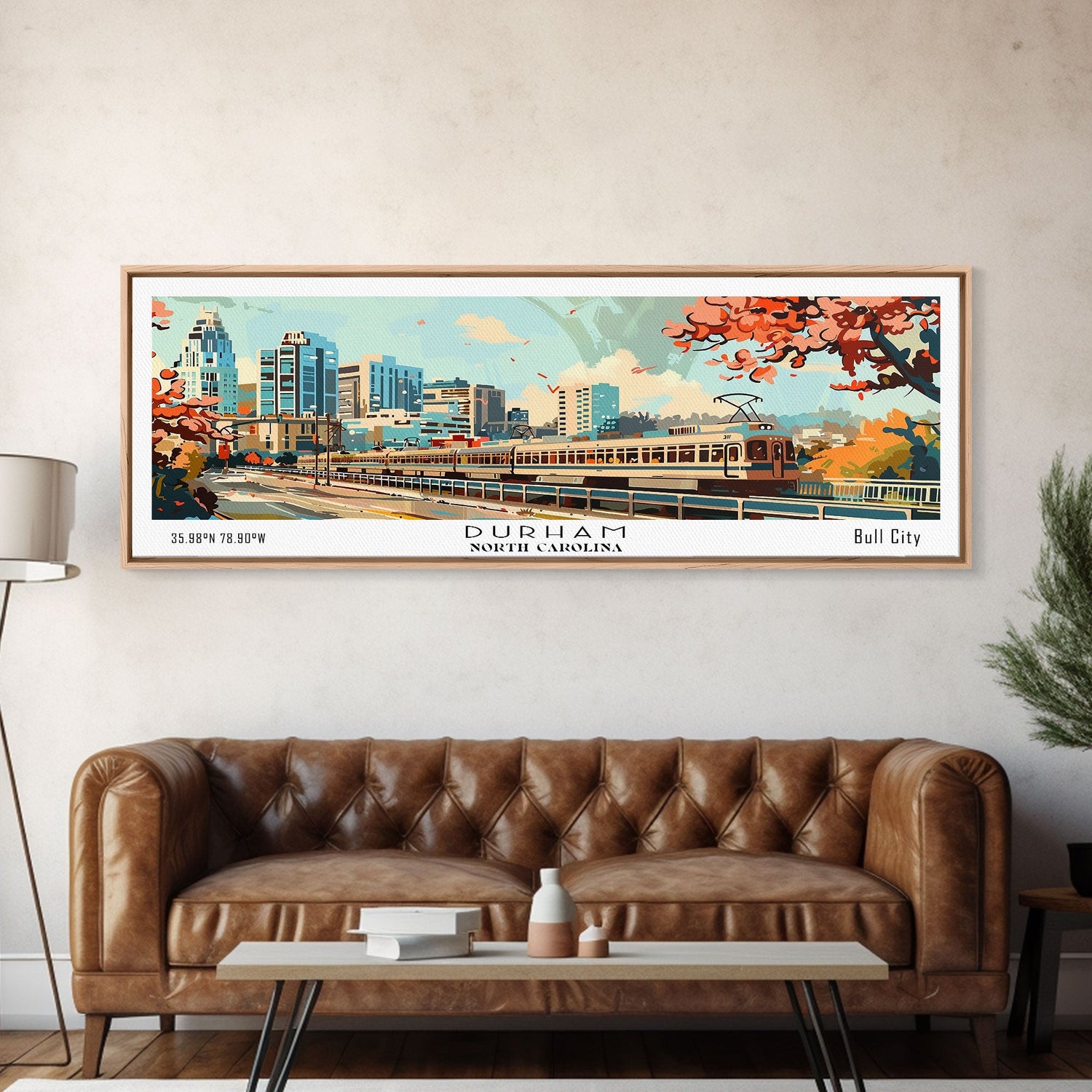 Durham North Carolina Panoramic Painting, Mid Century Modern Framed Canvas Print, Retro Pop Art Travel Poster, Wall Decor, Home Decor, Wall Hanging