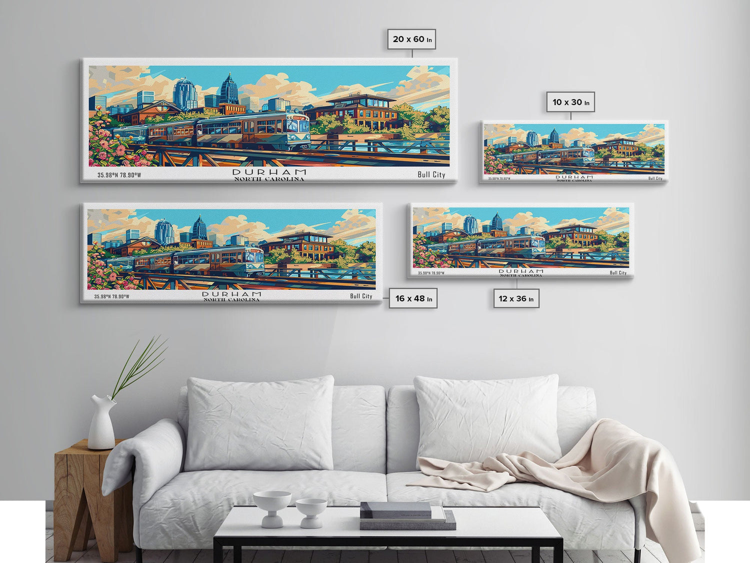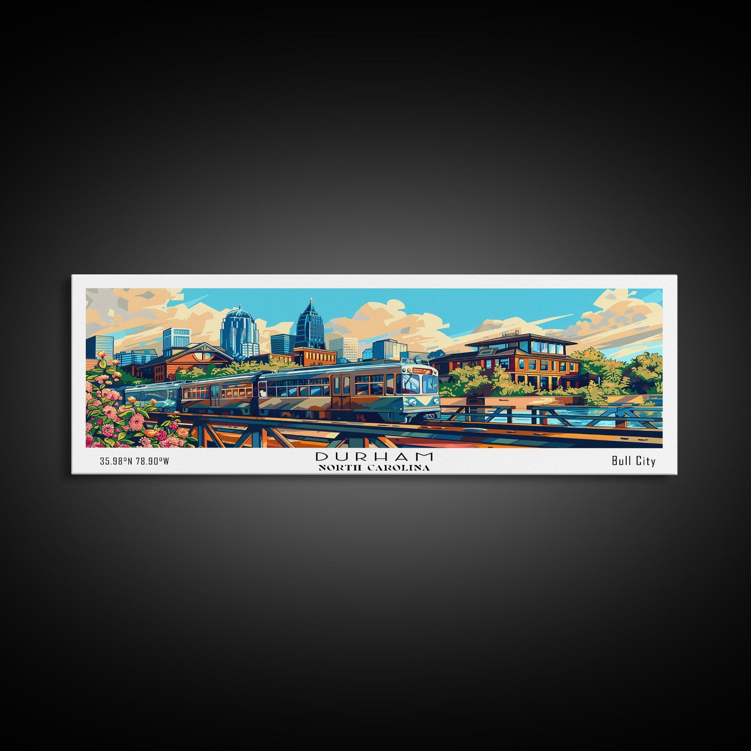 Durham North Carolina Panoramic Travel Poster Framed Canvas Print, Mid Century Modern Art, Pop Art Style, Wall Art Decor, Home Decoration - 10x30 Inches / No Frame - Stretched Canvas Only is backordered and will ship as soon as it is back in stock.