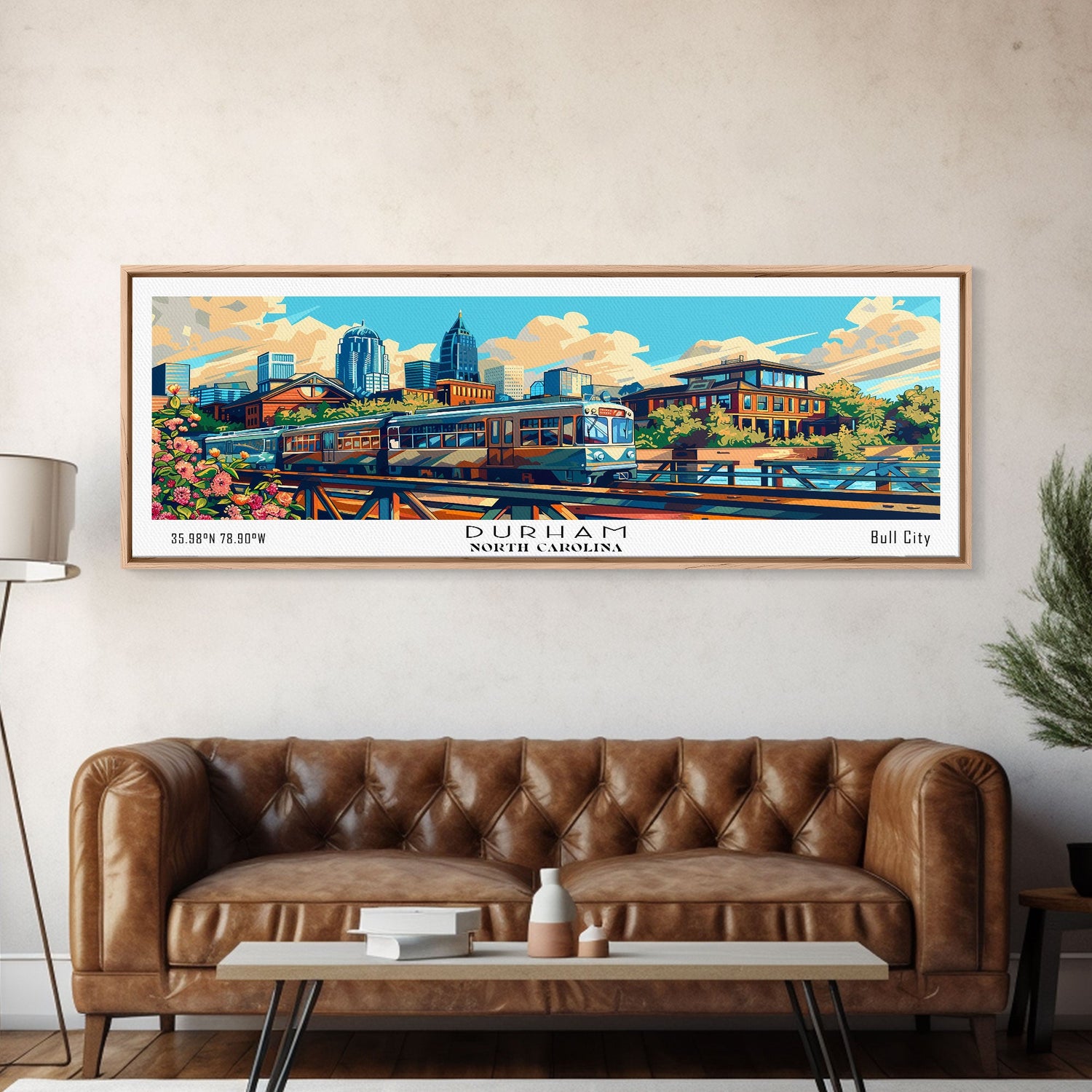 Durham North Carolina Panoramic Travel Poster Framed Canvas Print, Mid Century Modern Art, Pop Art Style, Wall Art Decor, Home Decoration