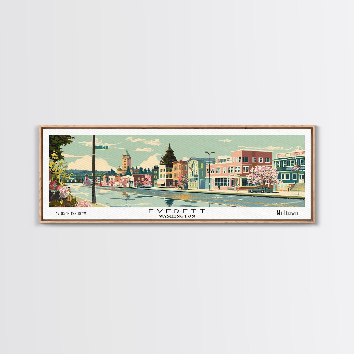 Everett Washington Panoramic Painting, Mid Century Modern Framed Canvas Print, Retro Pop Art Travel Poster, Home Wall Decor
