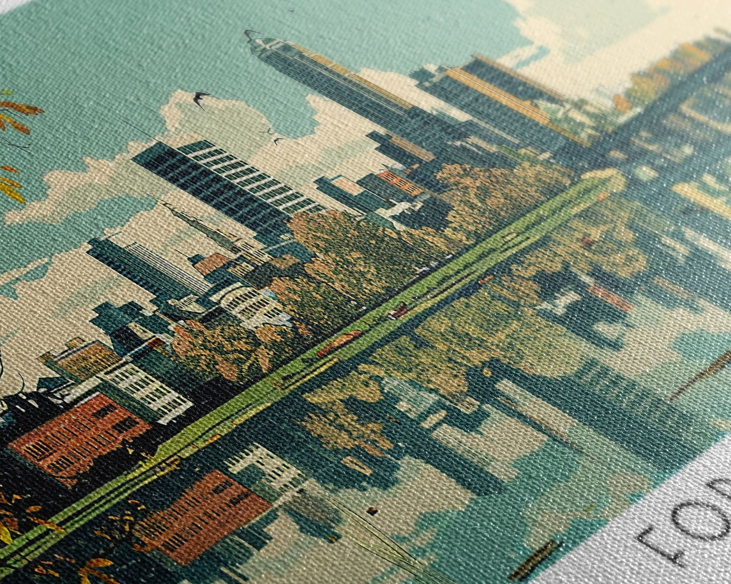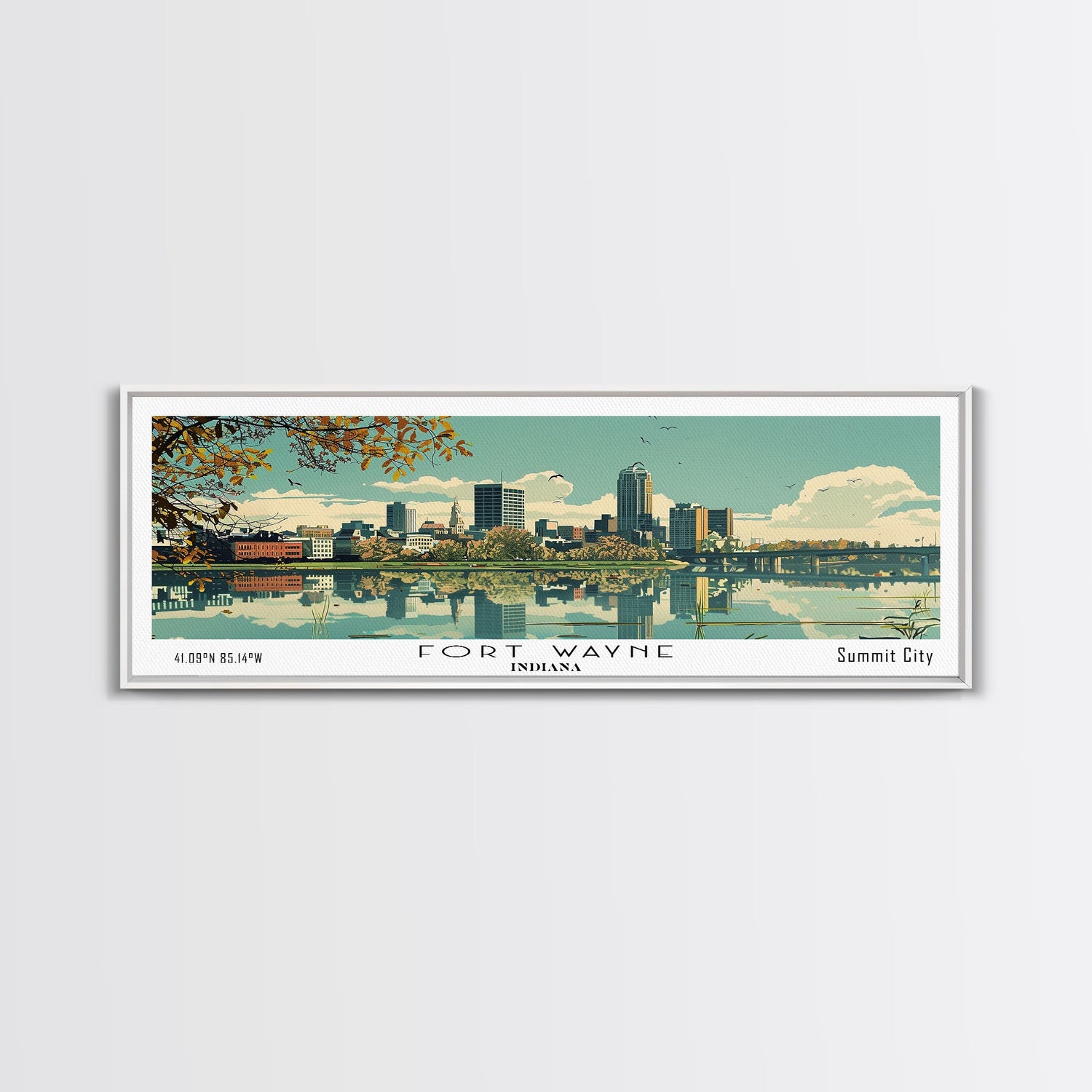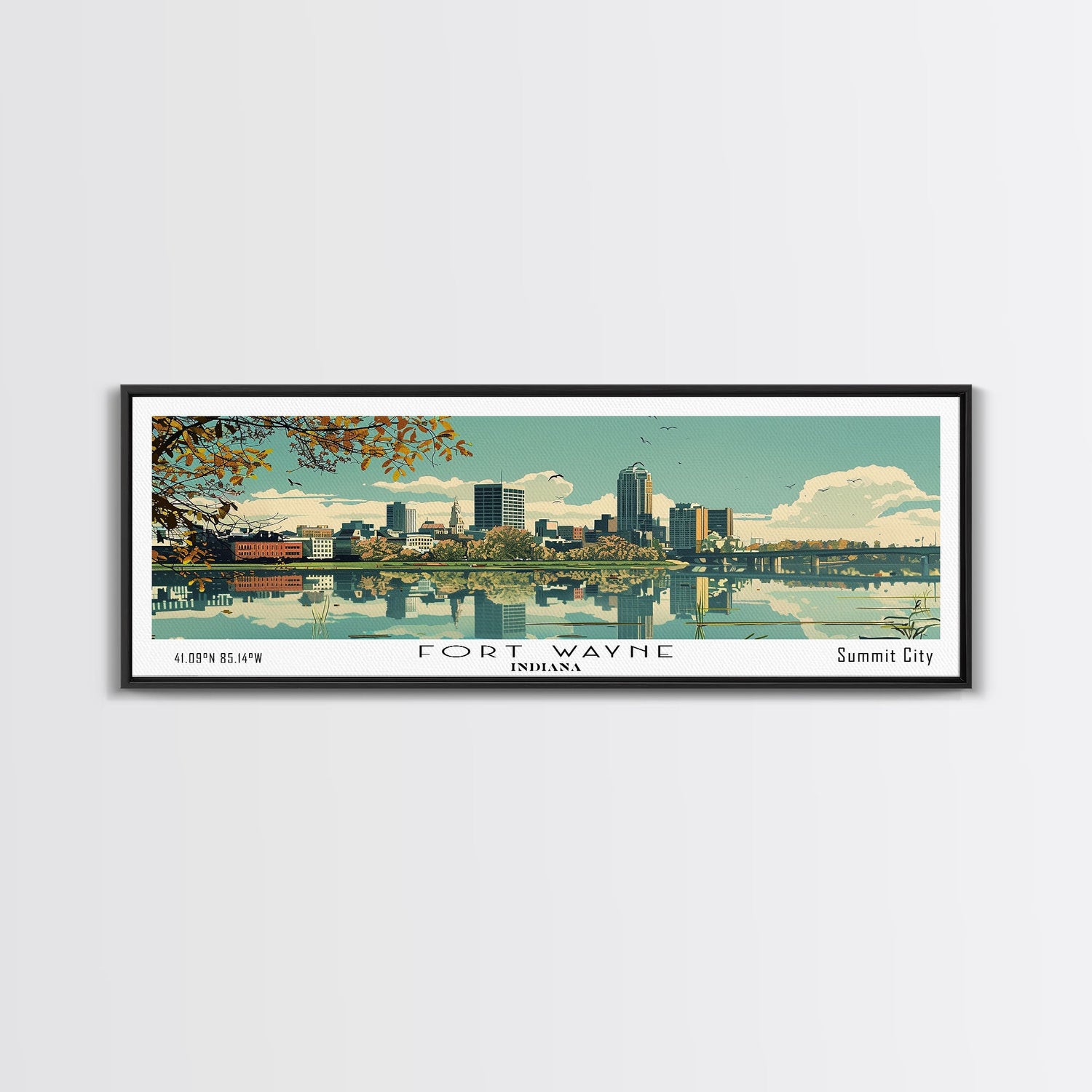 Fort Wayne Indiana Panoramic Art, Mid Century Modern Framed Canvas Print, Retro Pop Art Travel Poster, Home Wall Decor
