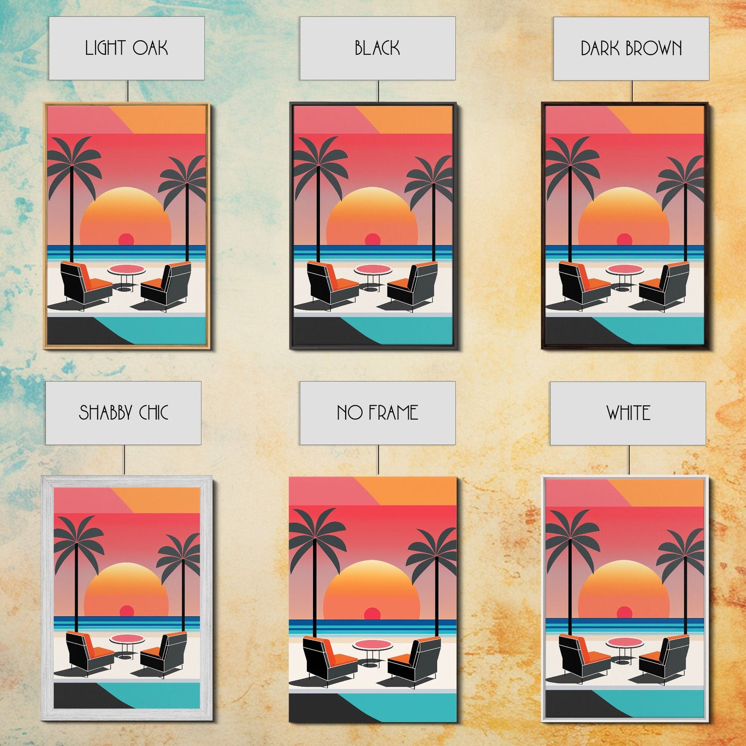 Framed Canvas Print - Art Deco Sunset, Minimalist Beach, Palm Trees, Retro Style, Synthwave, Vaporwave, Minimalist Abstract Decor
