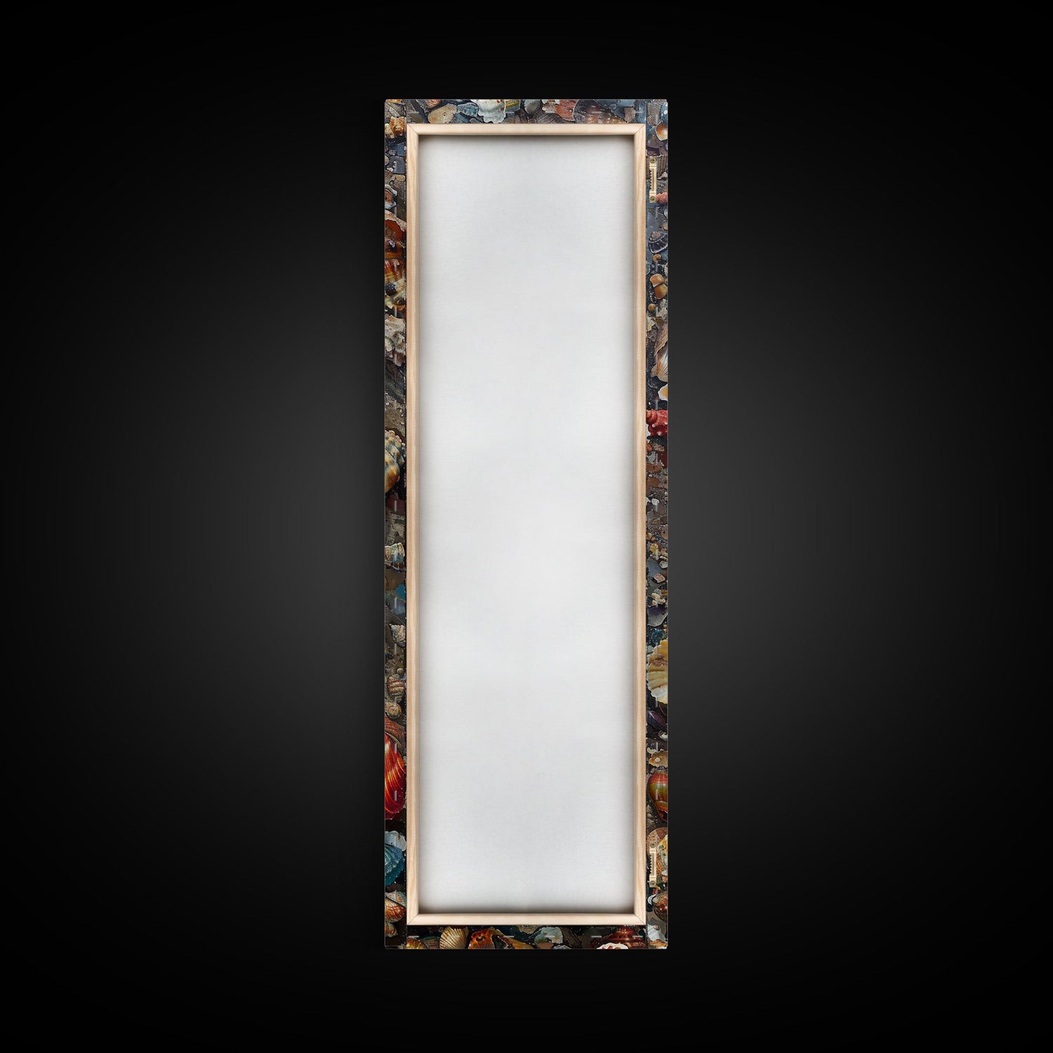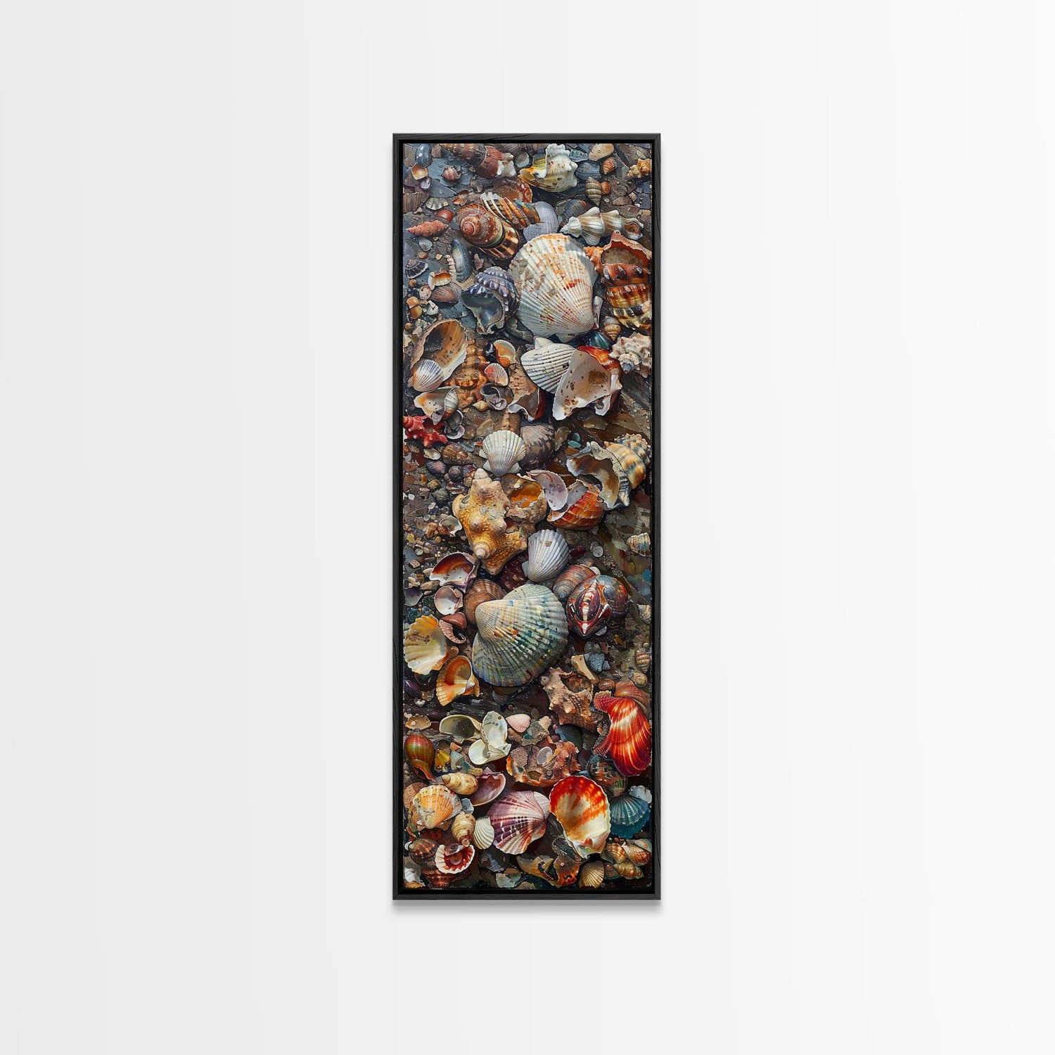Framed Canvas Print Skinny Art of a Variety of Colorful Seashells Arranged in a Textured Pattern, Perfect Tall Art for Beach Themed Rooms