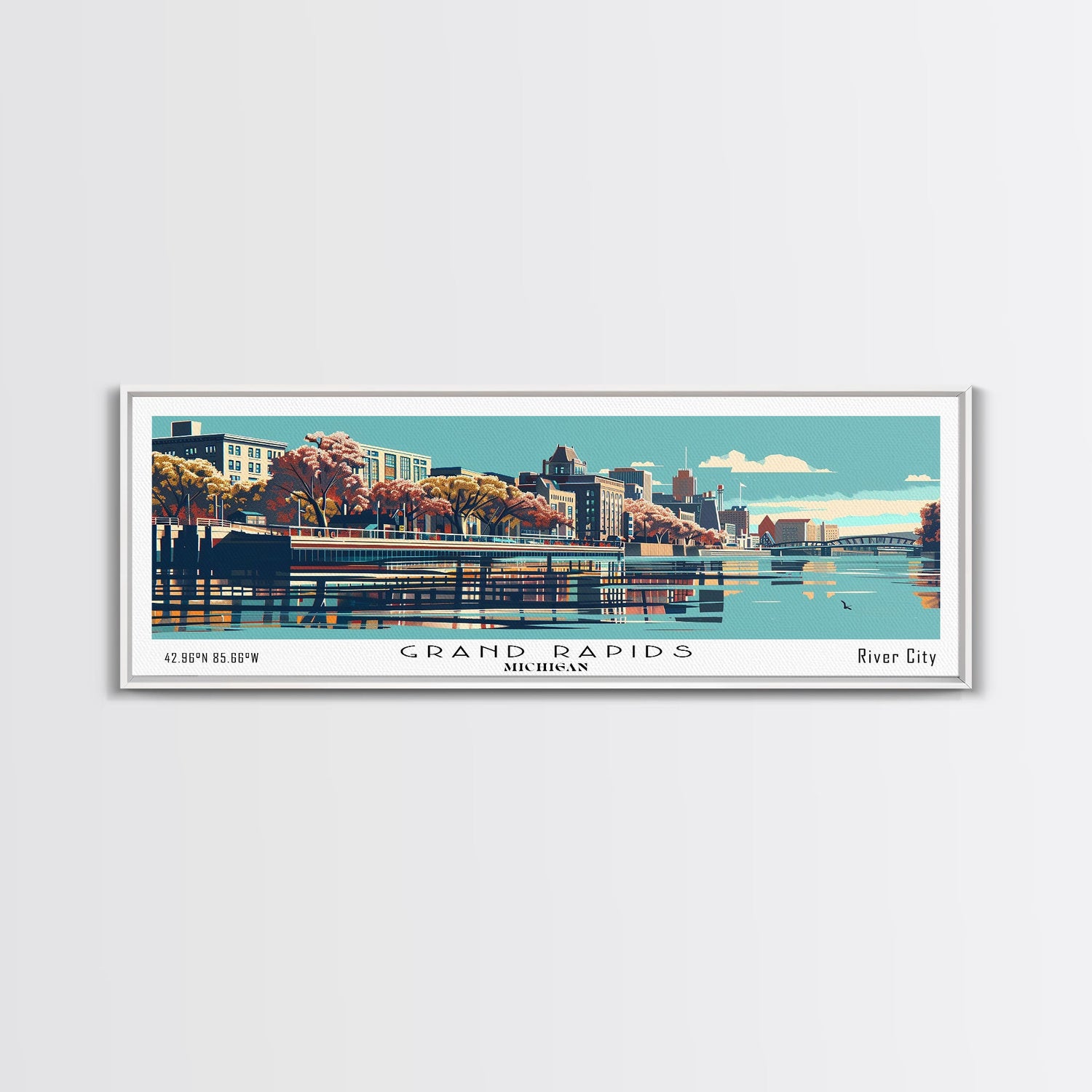 Grand Rapids Michigan Panoramic Painting, Framed Canvas Print, Mid Century Modern Wall Art, Retro Pop Art Travel Poster, Cityscape Decor, Living Room Art, Office Wall Art