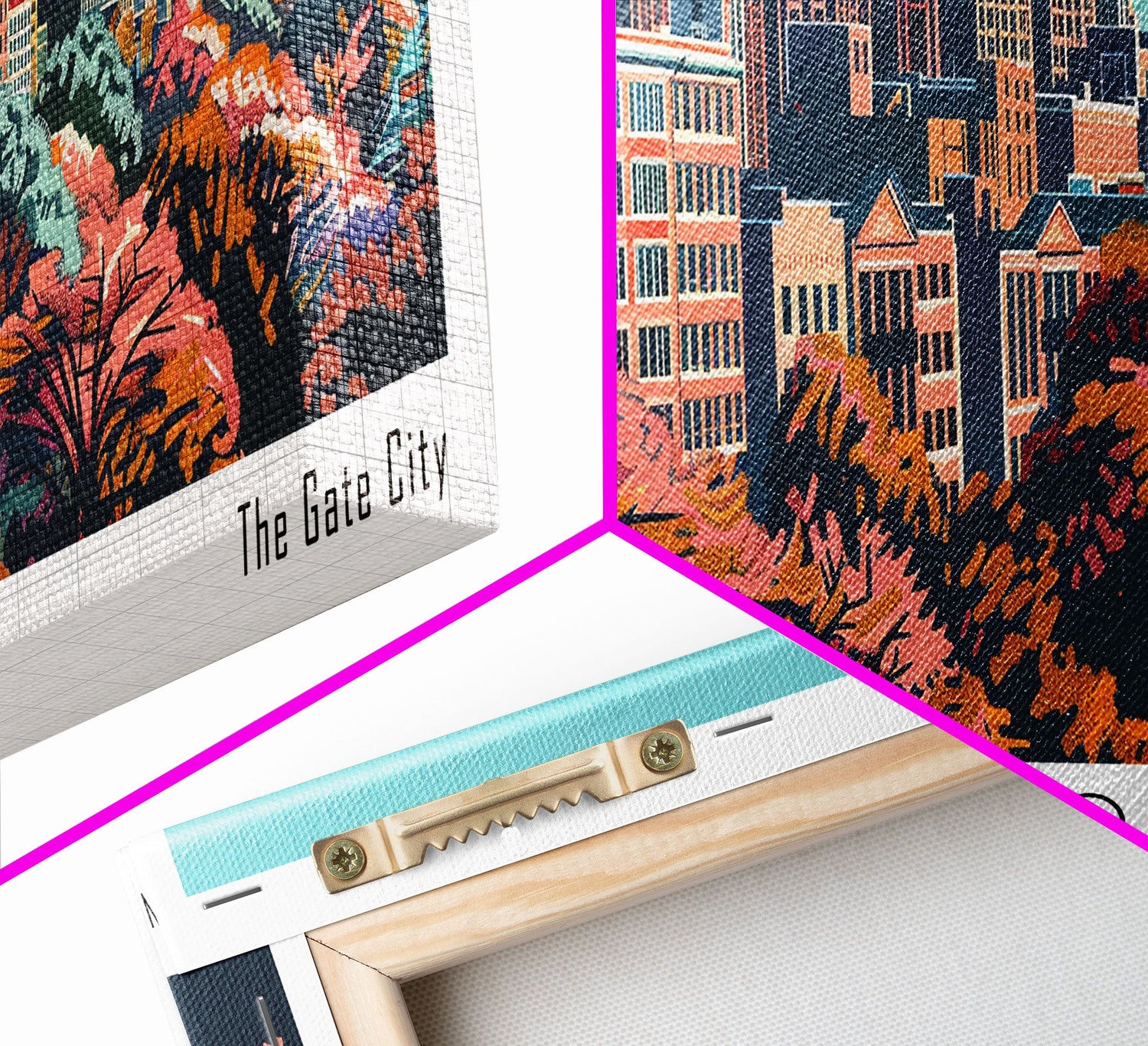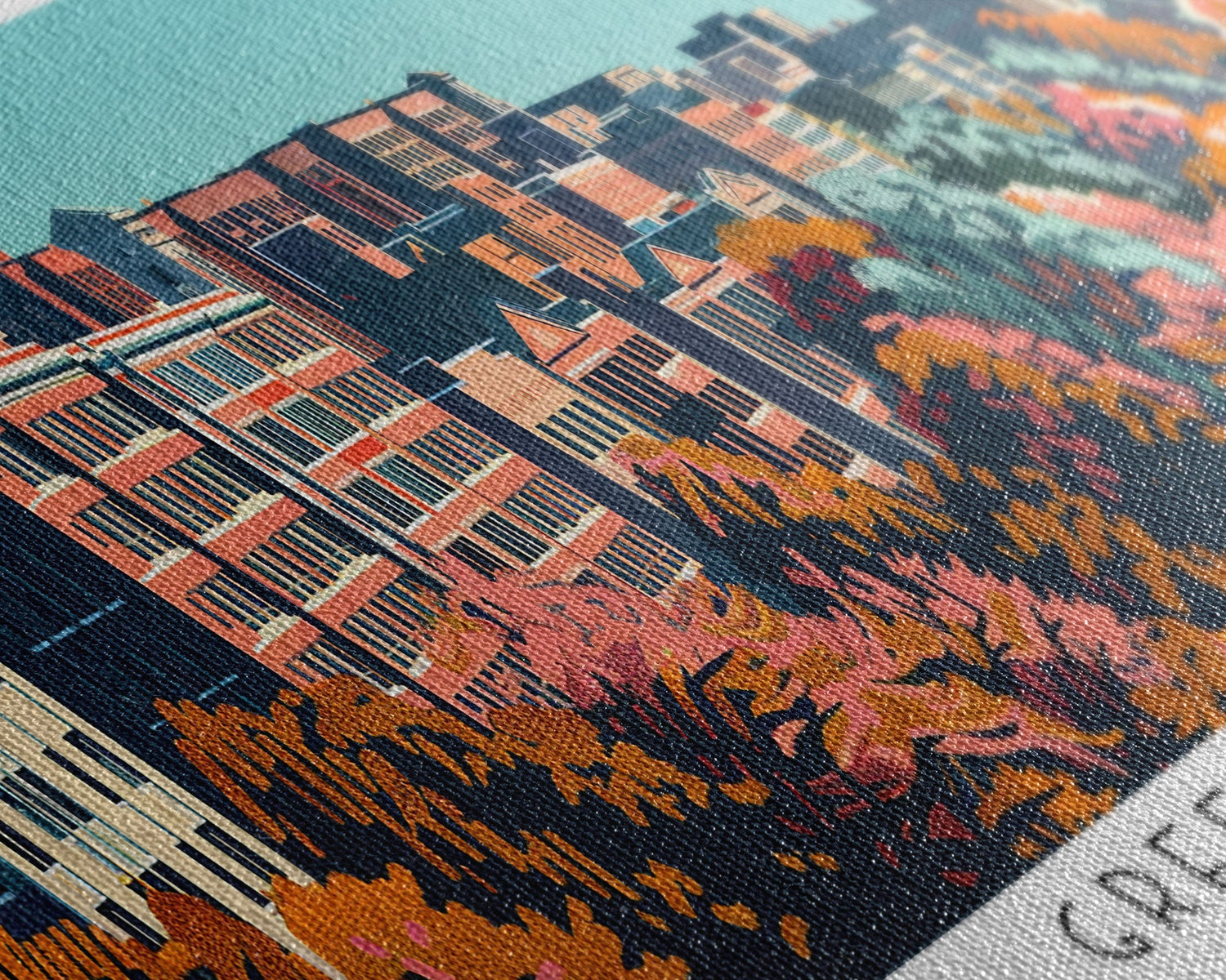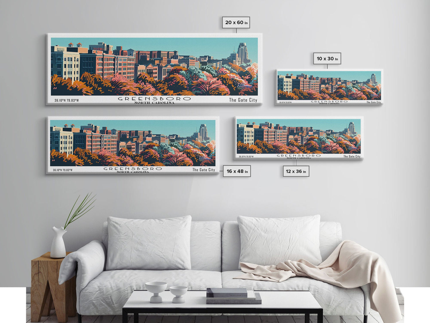 Greensboro North Carolina Panoramic Painting, Mid Century Modern Framed Canvas Print, Retro Pop Art Travel Poster, Cityscape Wall Art, Living Room Decor, Office Art