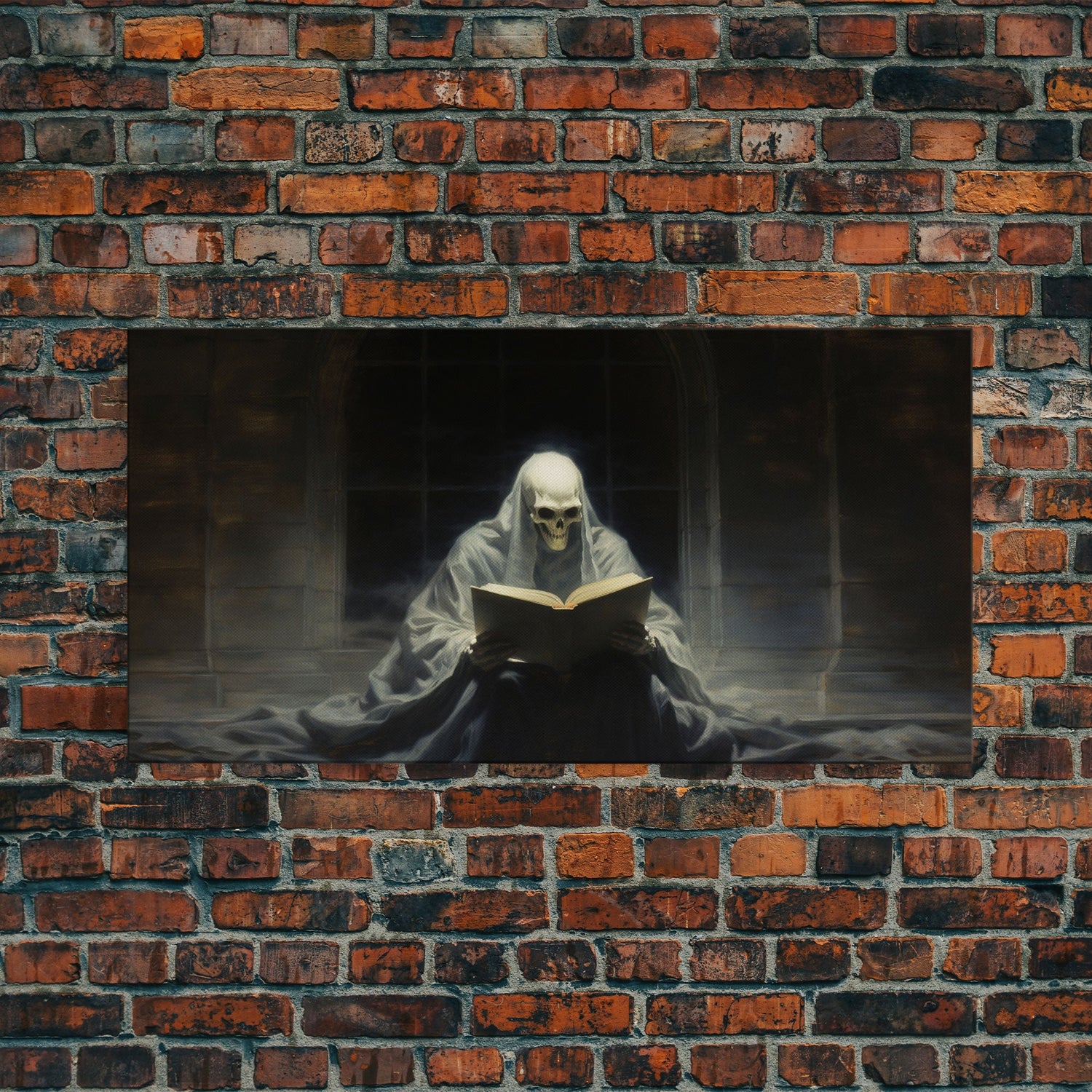 Grim Reaper Reading A Book In A Haunted Library, Framed Canvas Print, Victorian Oil Painting Style, Spooky Halloween Decor, Goth Art - 10x20 Inches / No Frame - Stretched Canvas Only is backordered and will ship as soon as it is back in stock.