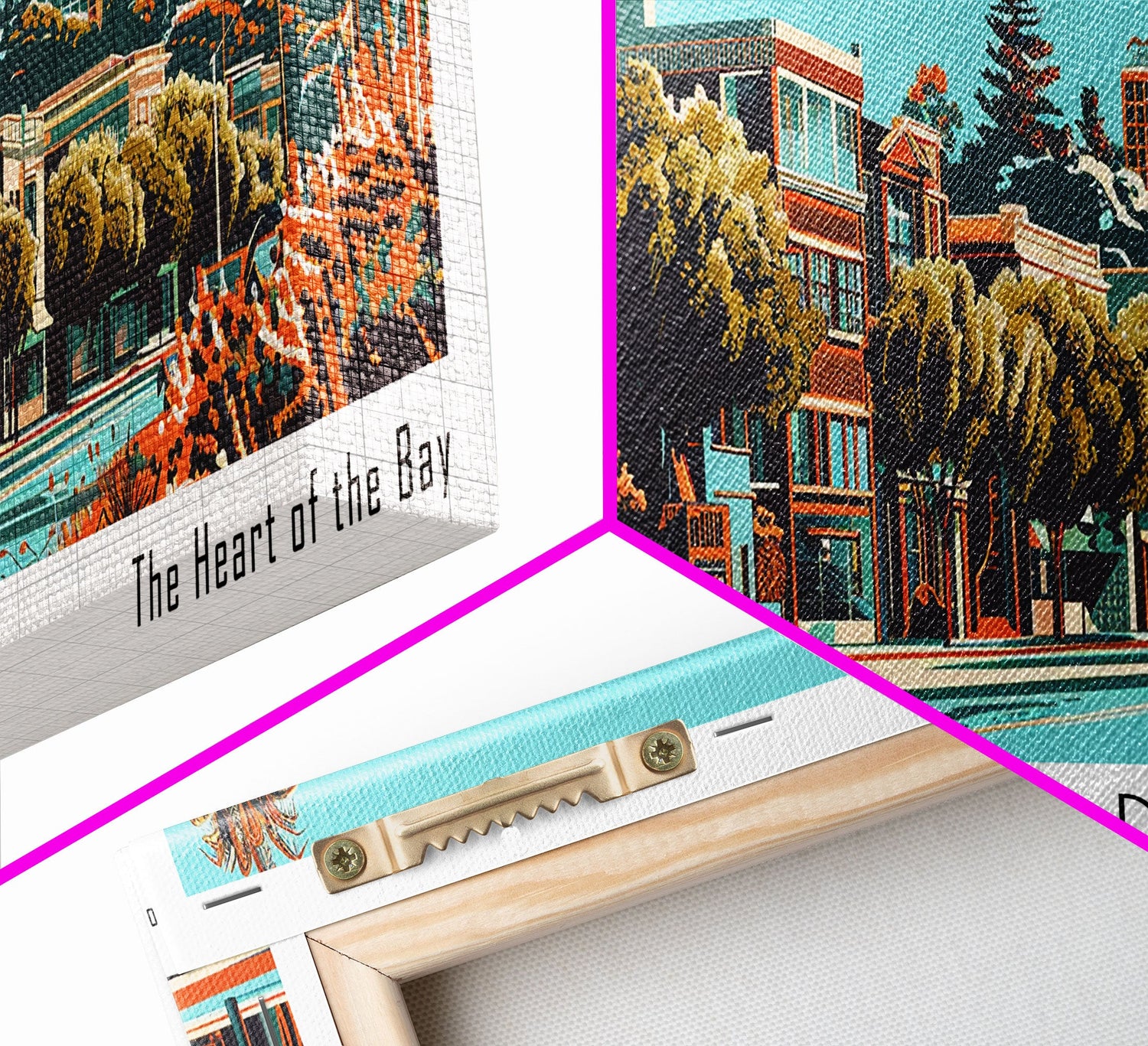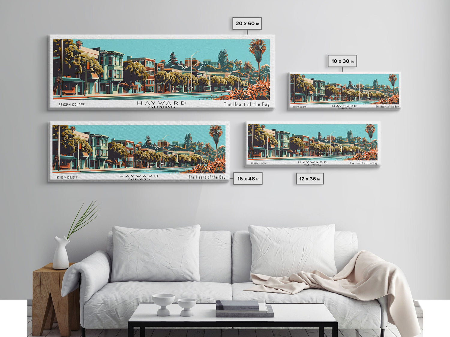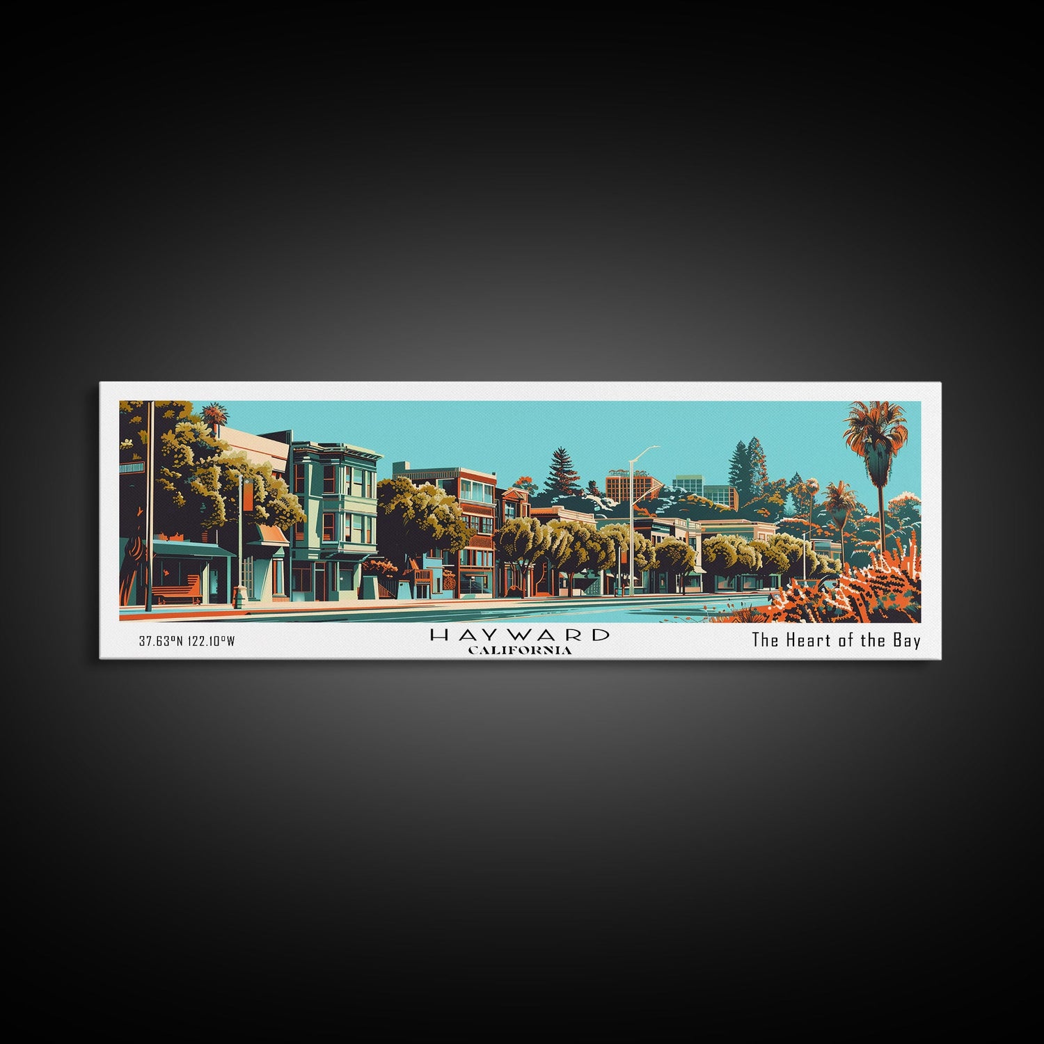 Hayward California Panoramic Painting, Framed Canvas Print, Mid Century Modern Wall Art, Retro Pop Art Travel Poster, Cityscape Decor, Office Wall Art, Home Decor - 10x30 Inches / No Frame - Stretched Canvas Only is backordered and will ship as soon as it is back in stock.