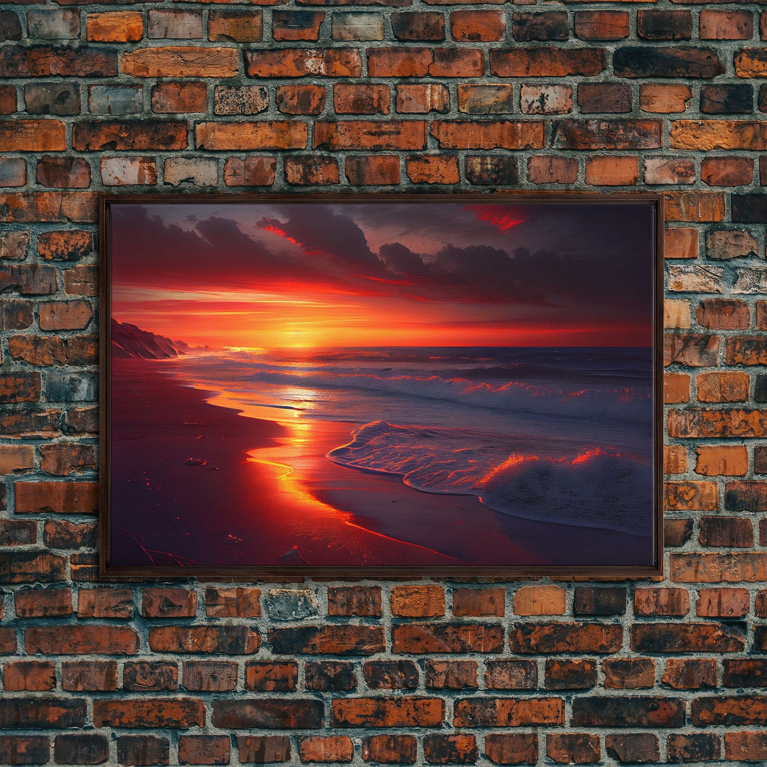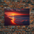 High tide slowly rolling in at sunset, beautiful beach art, framed canvas print