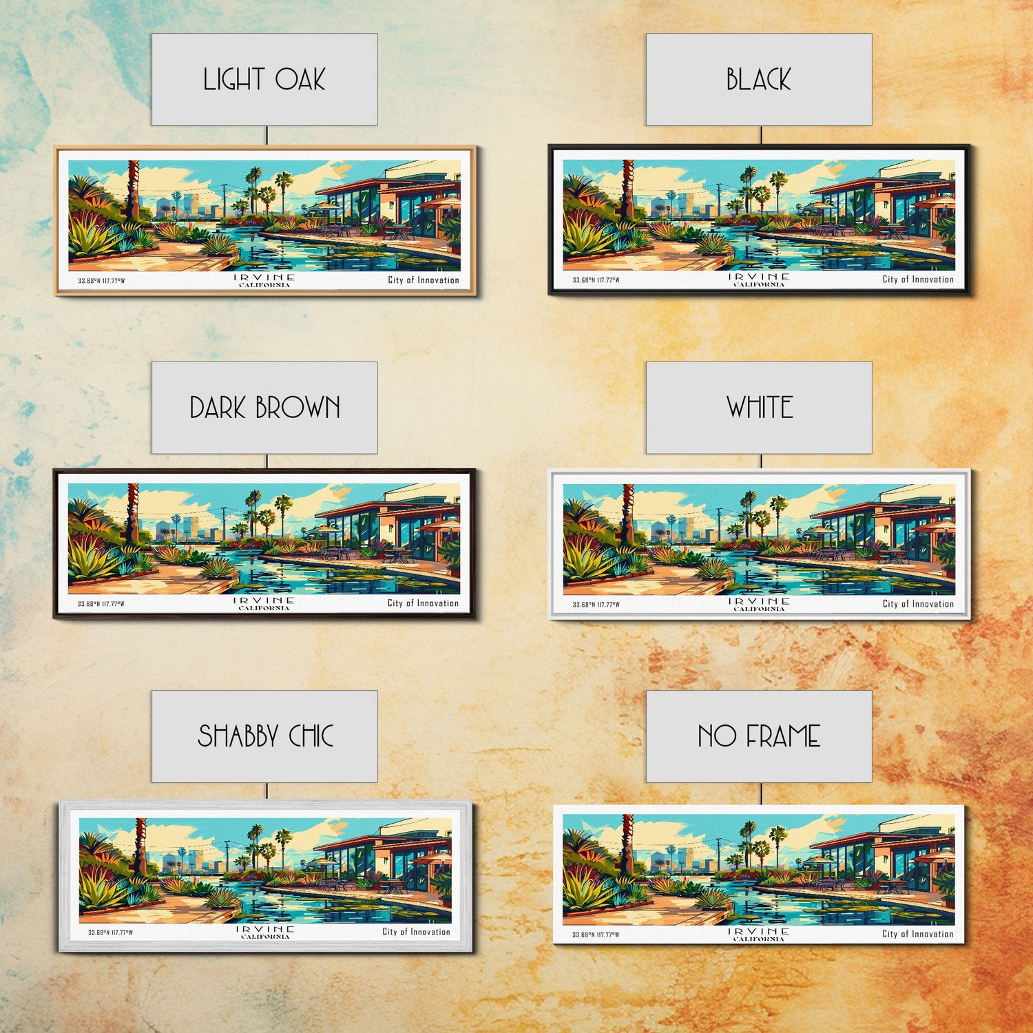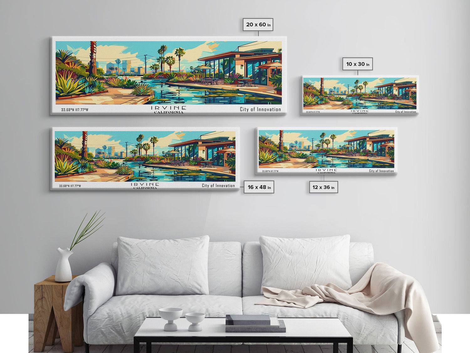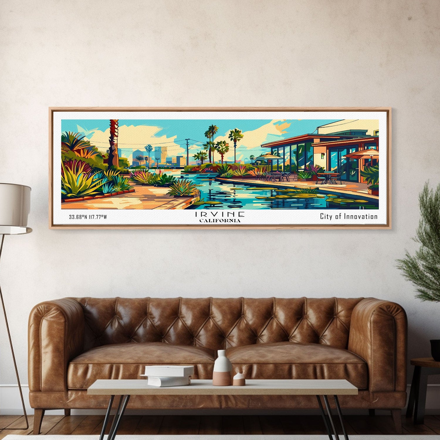 Irvine California Panoramic Travel Poster Framed Canvas Print, Mid Century Modern Art, Pop Art Style, Wall Art Decor, Home Decoration