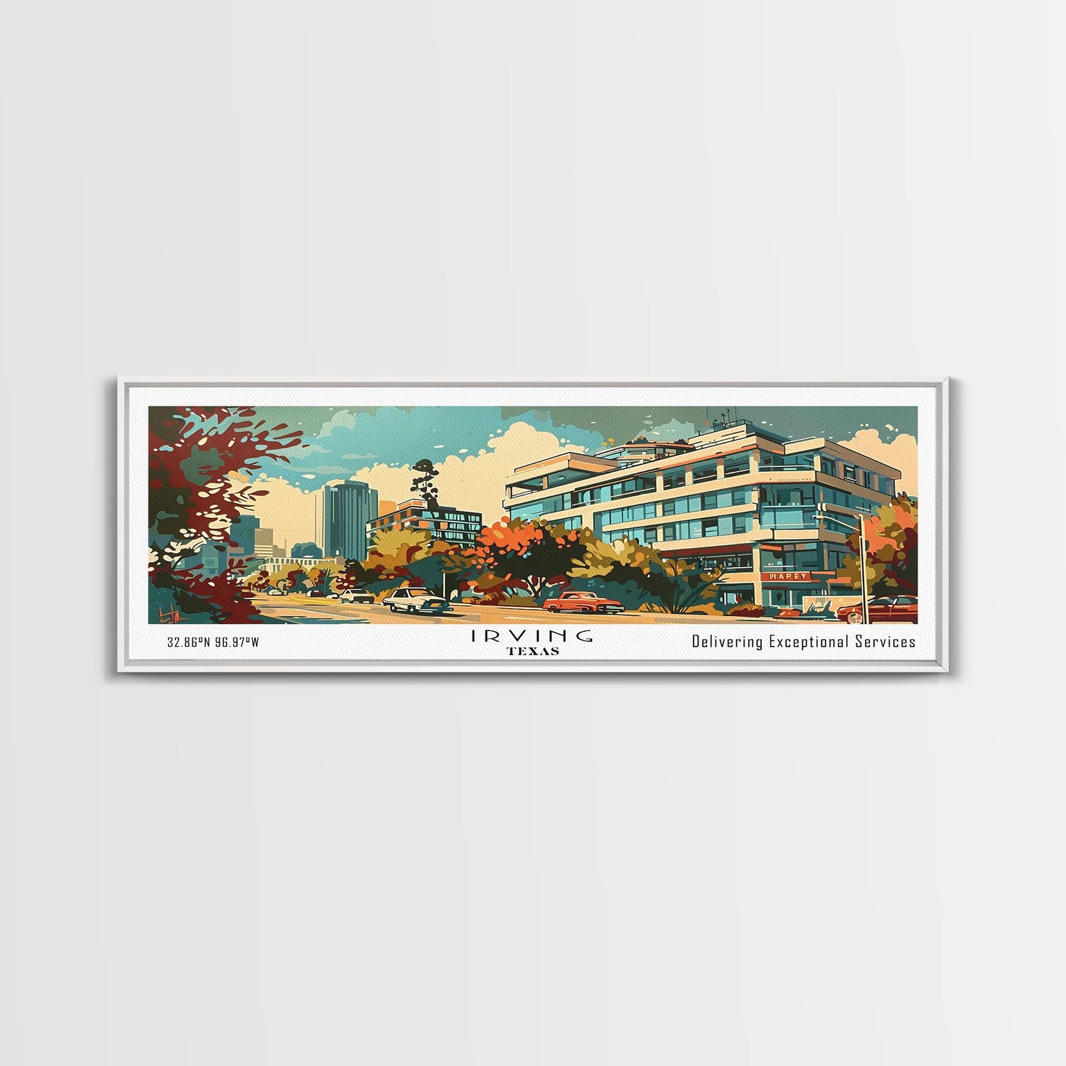 Irving Texas Panoramic Painting, Mid Century Modern Framed Canvas Print, Retro Pop Art Travel Poster, Wall Art, Home Decor, Office Wall Art, Gift Idea