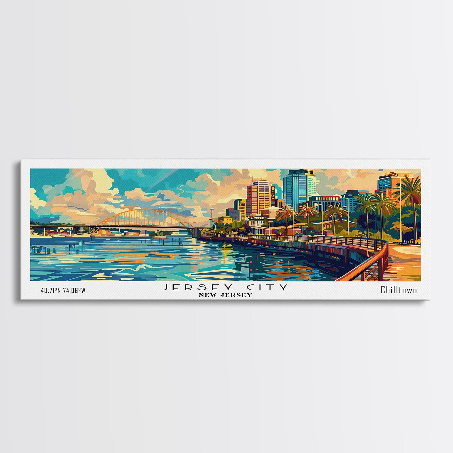 Jersey City New Jersey Panoramic Framed Canvas Print, Retro Style Wall Art, Mid Century Modern Home Decor, Pop Art Travel Poster