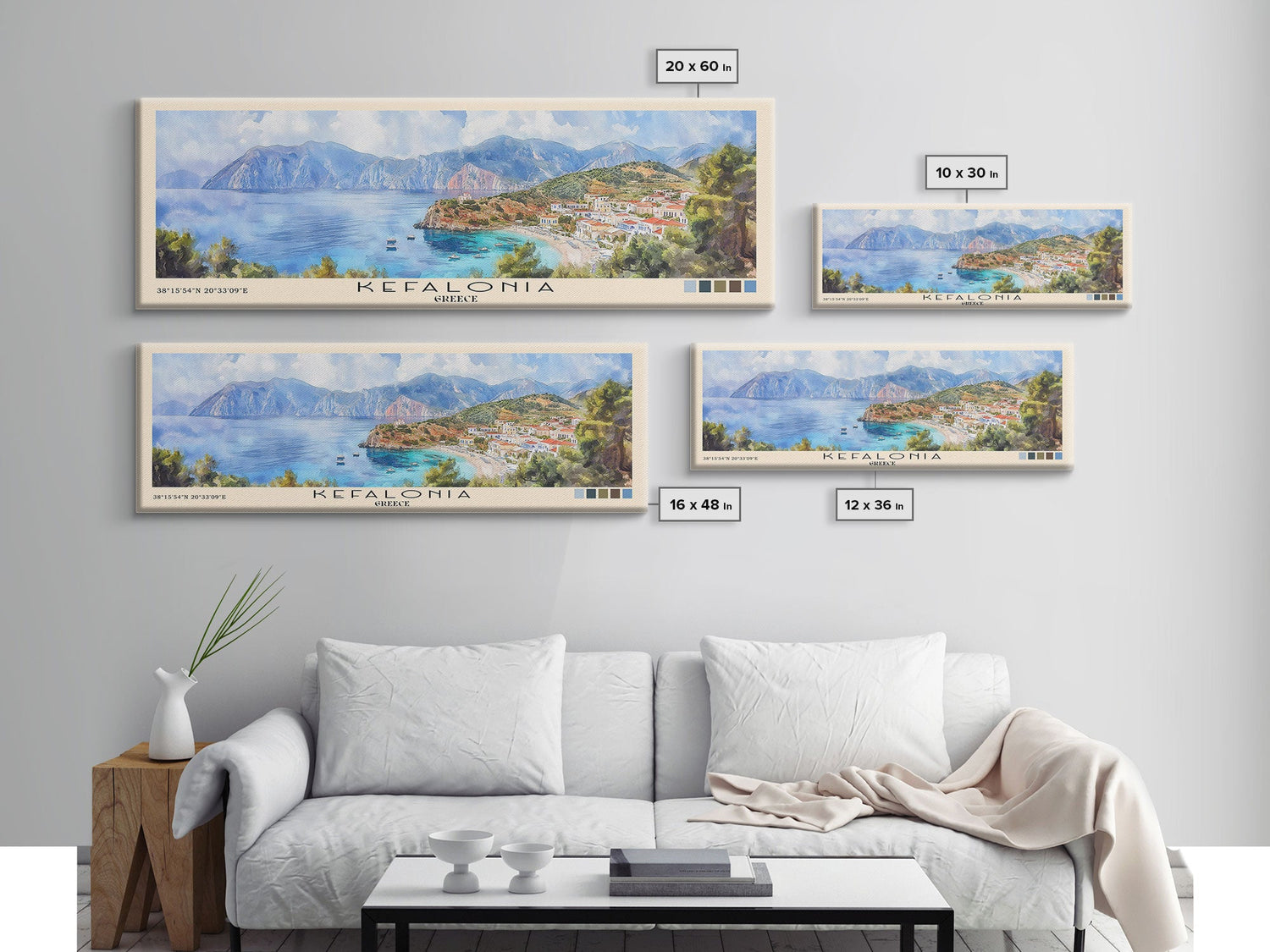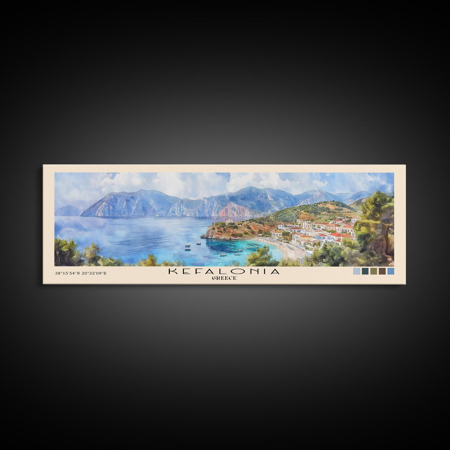 Kefalonia, Greece Watercolor Beach Print, Vacation Gift, Greece Wall Art, Framed Canvas Print, Framed Beach Painting - 10x30 Inches / No Frame - Stretched Canvas Only is backordered and will ship as soon as it is back in stock.