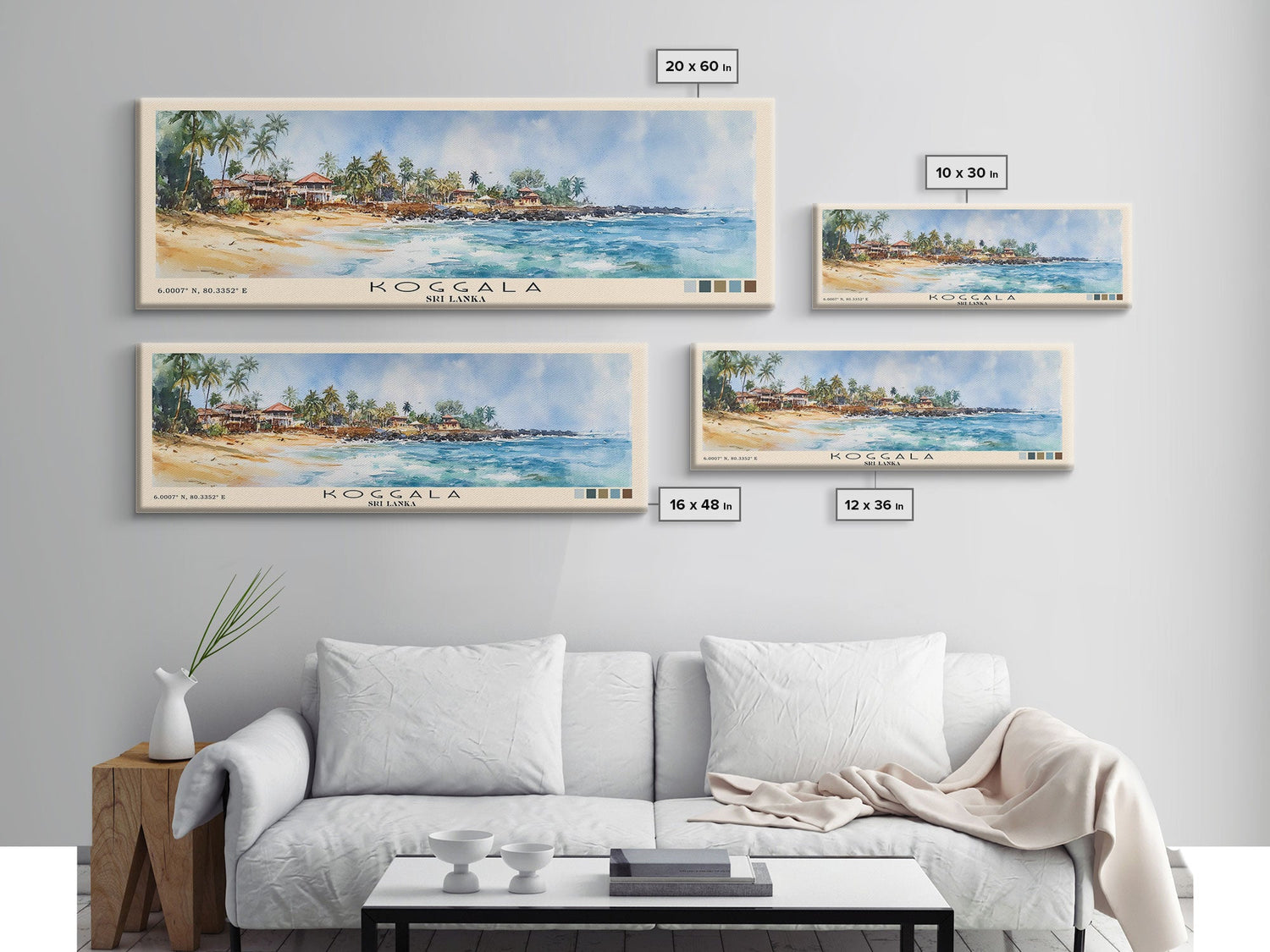 Koggala, Sri Lanka Watercolor Beach Print, Vacation Gift, Sri Lanka Wall Art, Framed Canvas Print, Framed Beach Painting - 10x30 Inches / No Frame - Stretched Canvas Only is backordered and will ship as soon as it is back in stock.